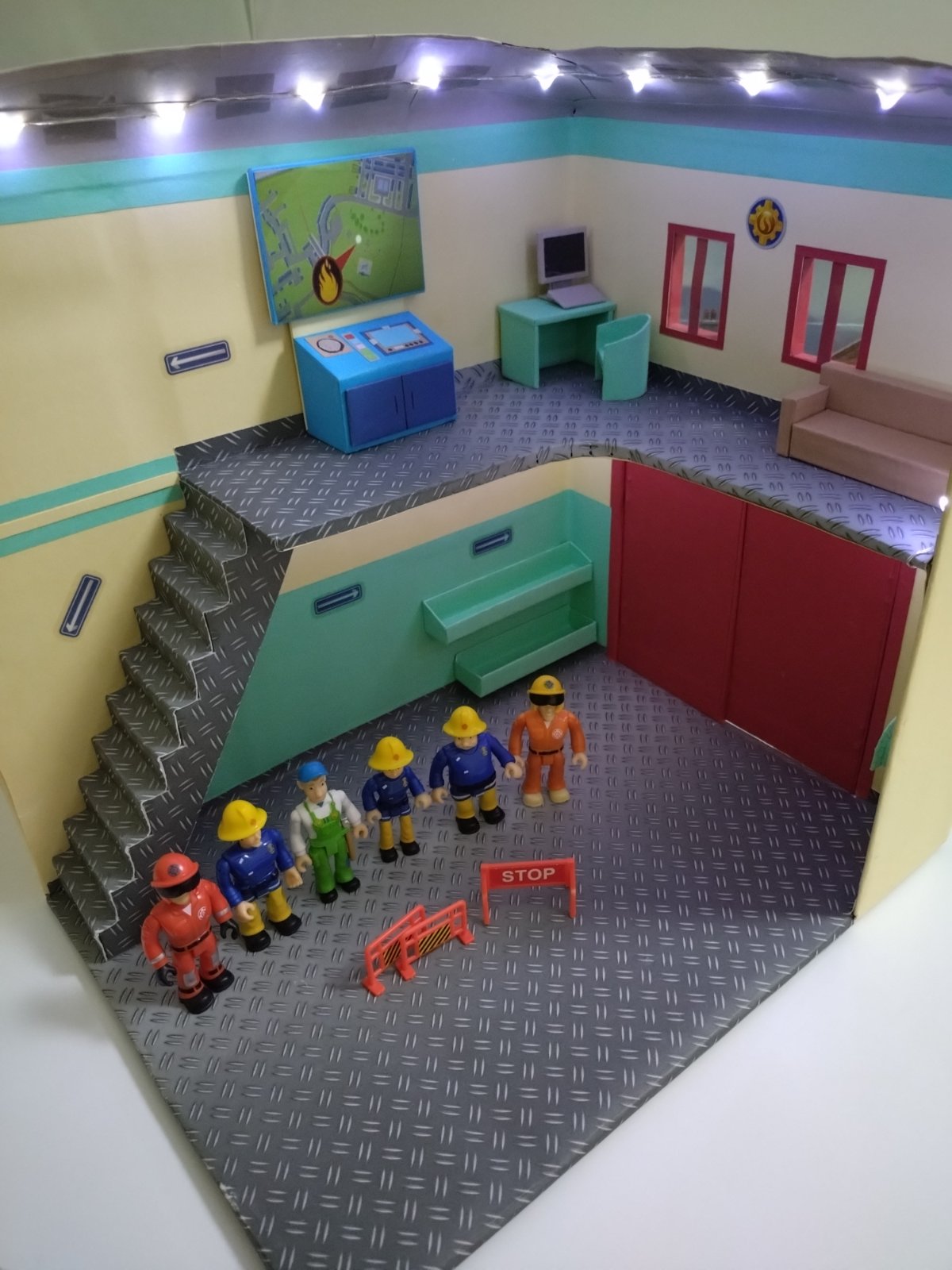 Stanica pre požiarnika Sama a kolegov s osvetlením a zariadením, funkčné dvere. Stanica je vyrobená z kartónu a pevného farebného papiera. Zadná strana z krabice ako pozadie dediny.