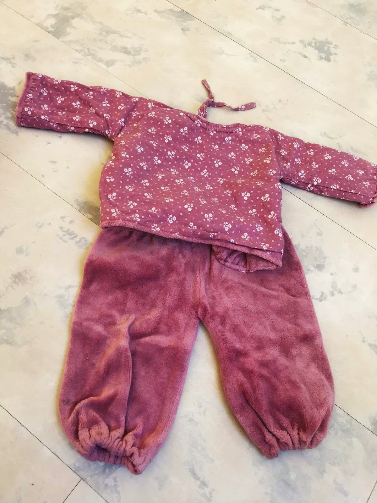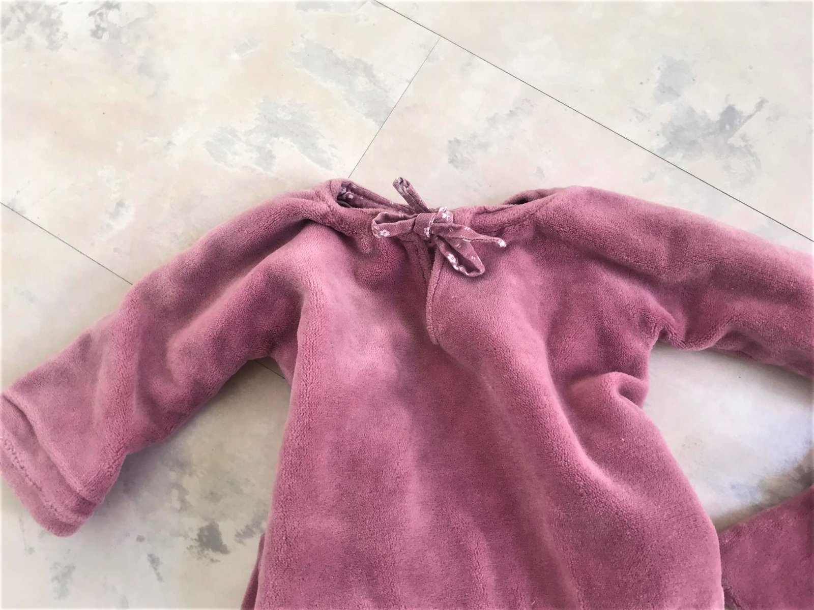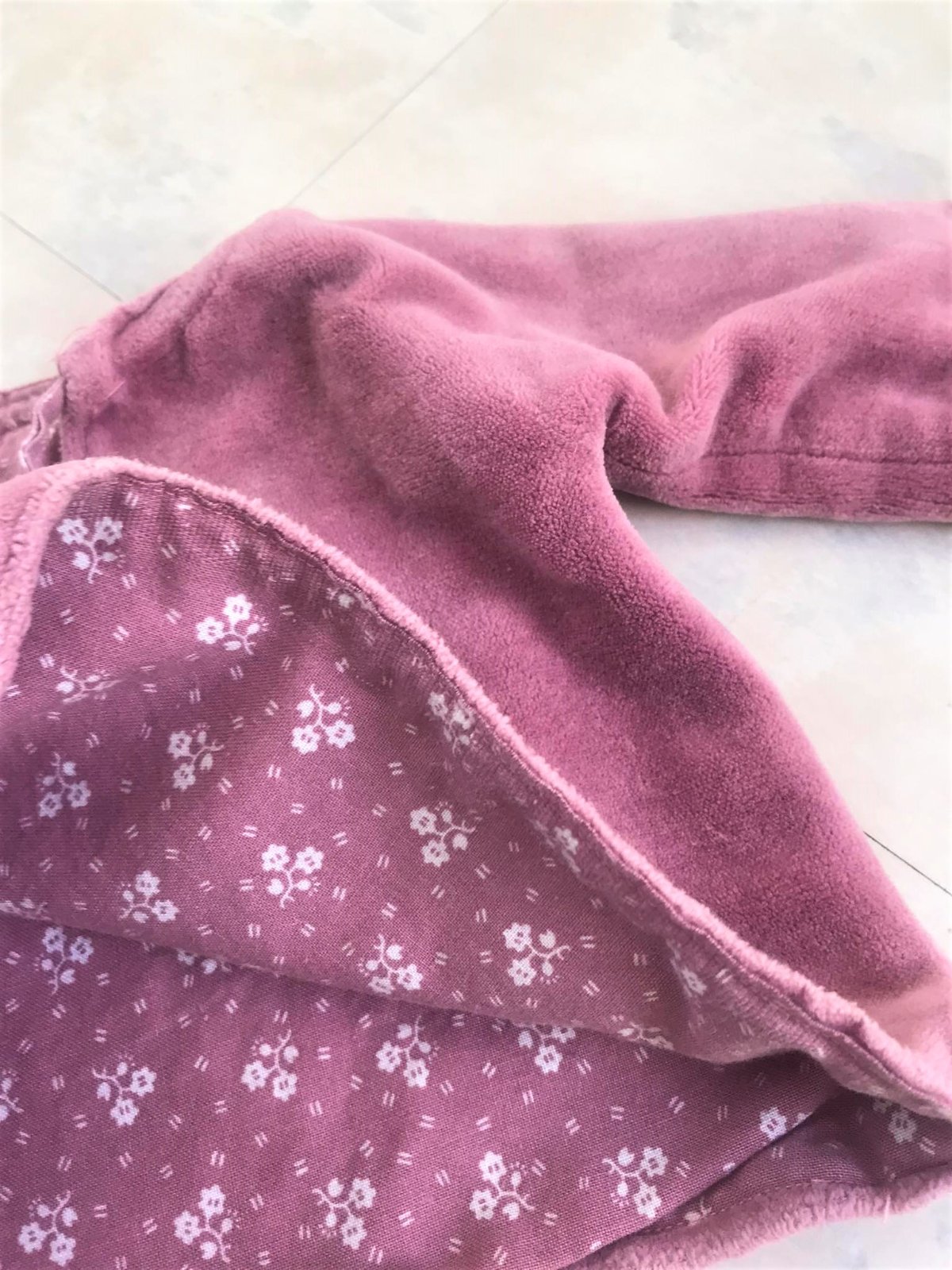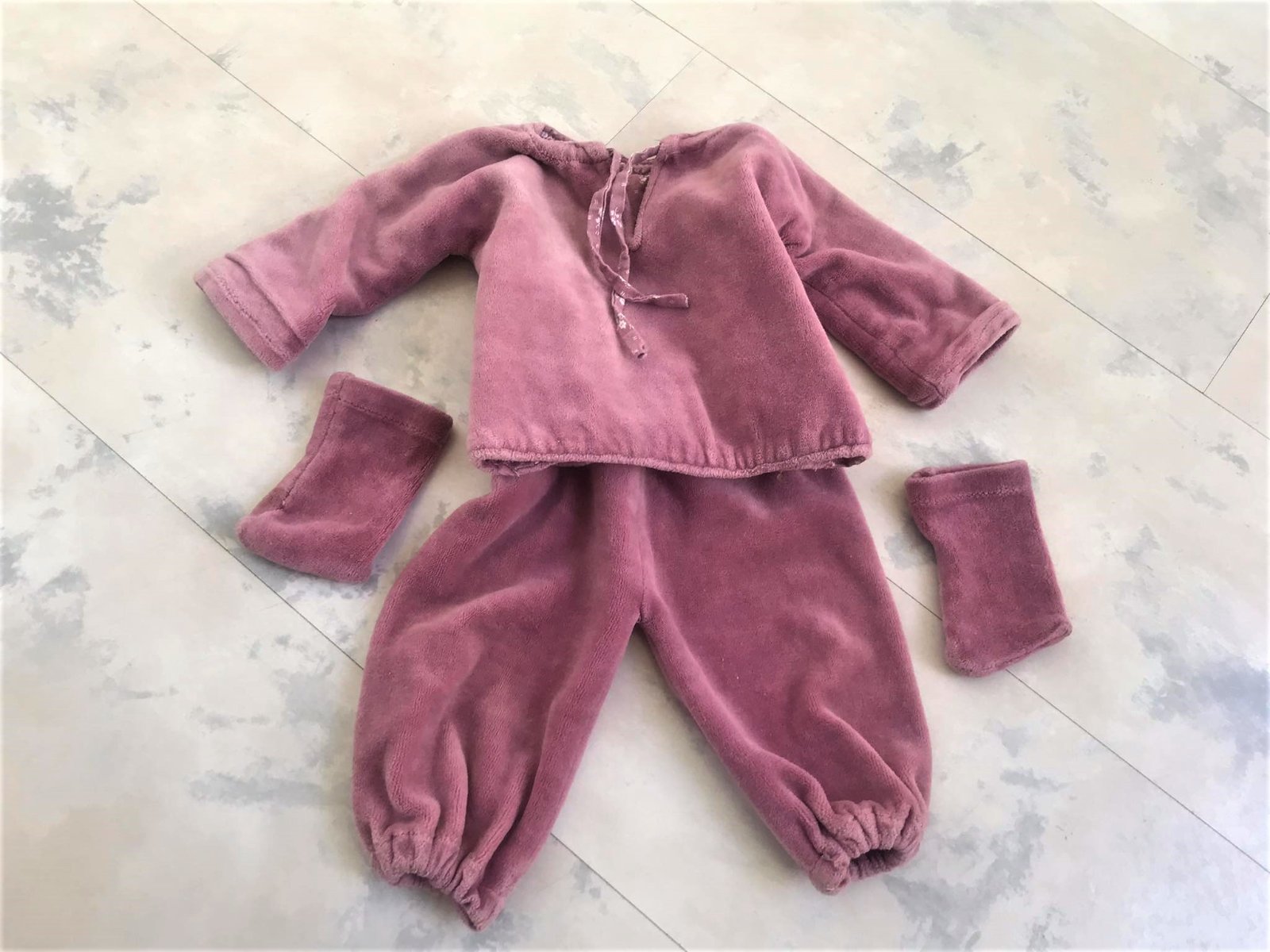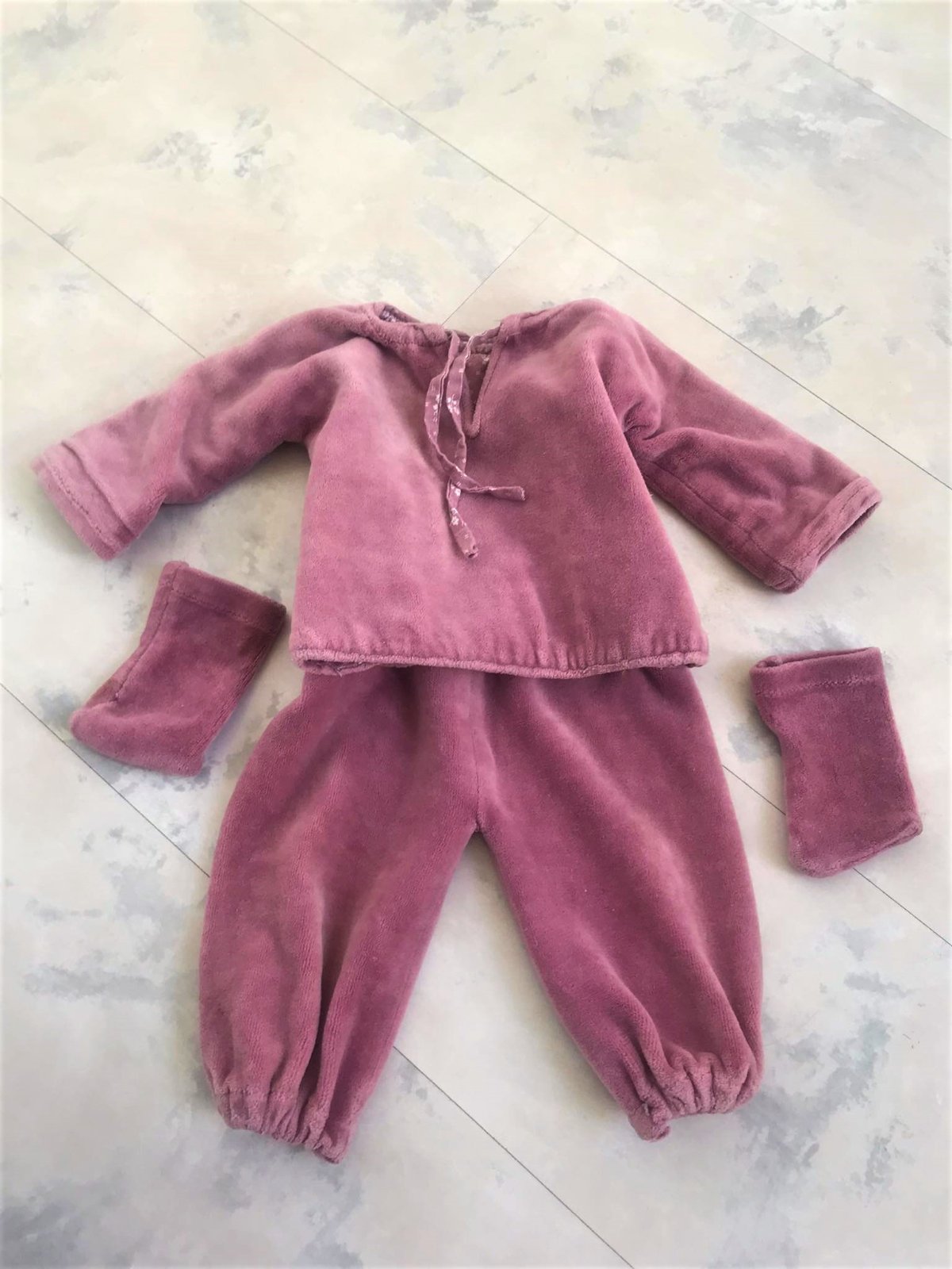 zamatové oblečenie na väčšiu bábiku, 4 ks, vrch je obojstanný duplovaný,dlžka = 23 cm šírka max. 23 x 2 cm, rukáv od otvoru na hlavu = 20 cm,nohavice do gumičky - pás max.27 x 2 cm,ale aj menej,stiahne sa gumičkou,dlžka = 27 cm, čižmičky = výška 10 cm, šírka 6 cm