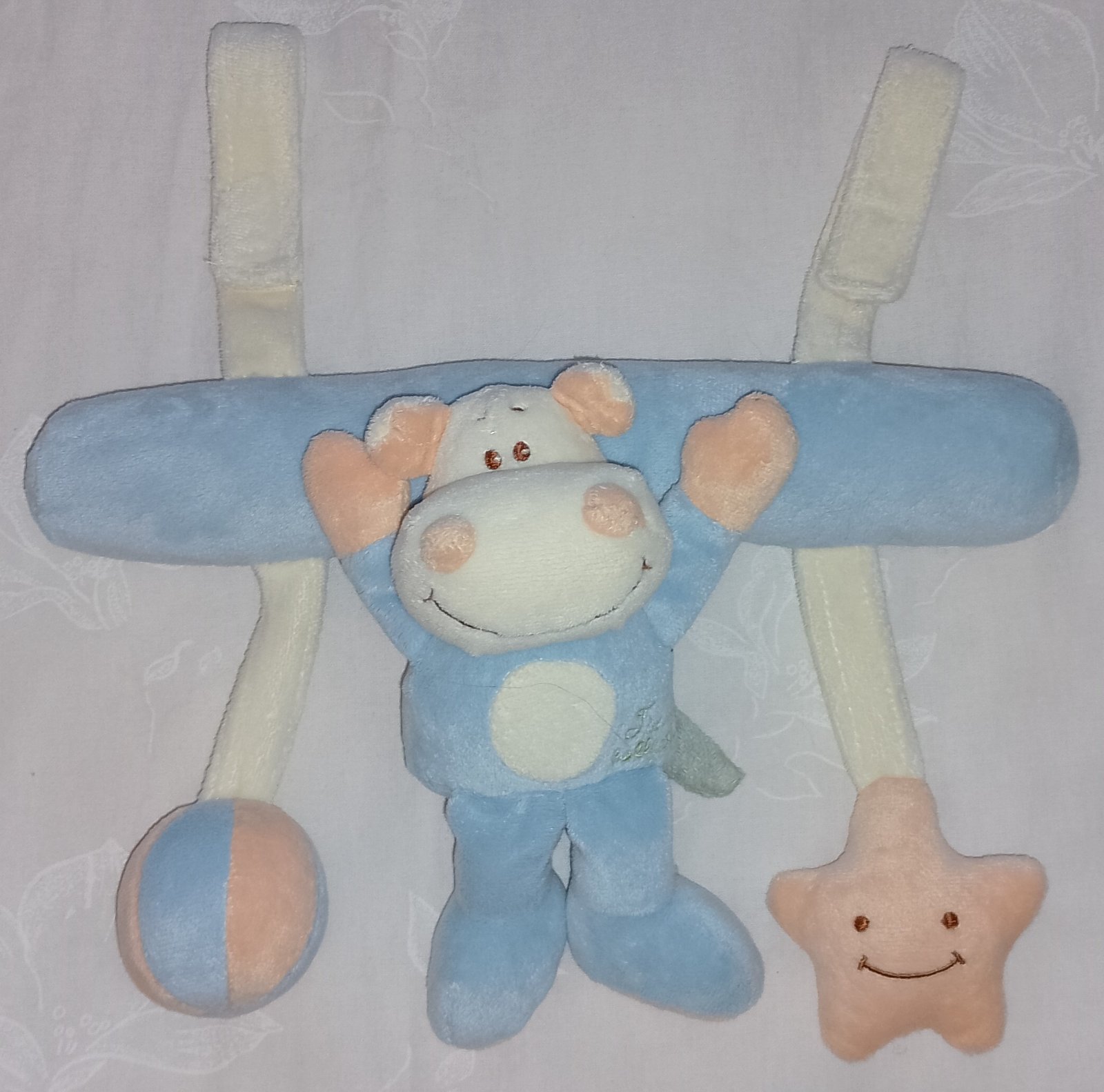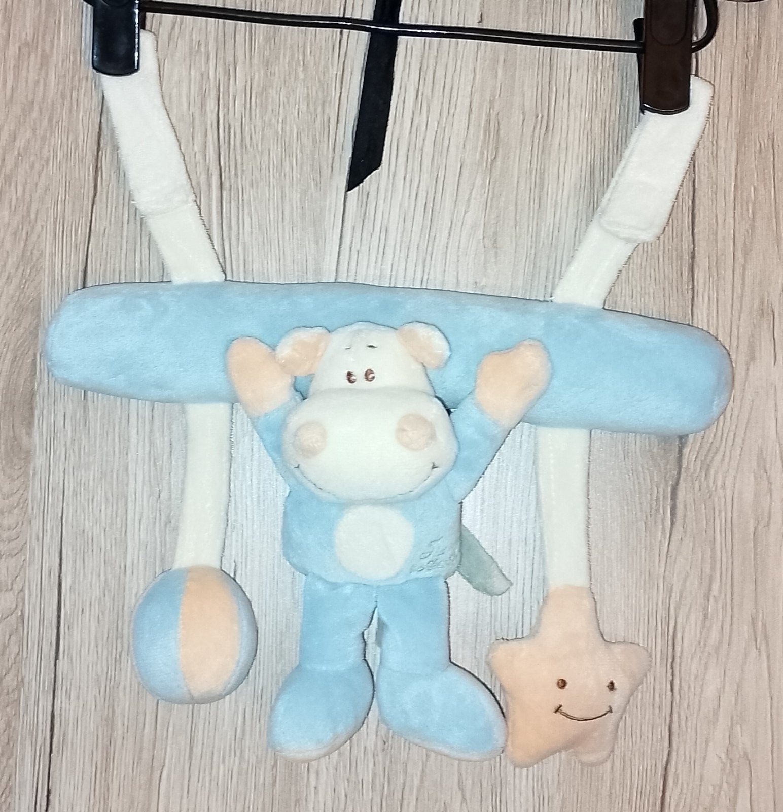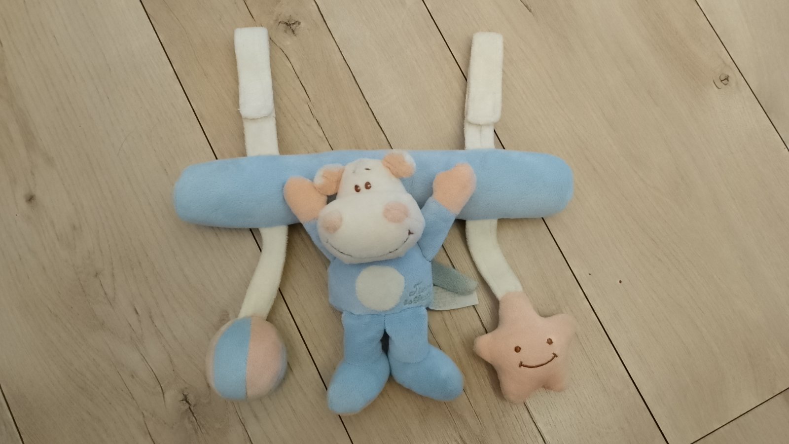 Predám závesnú hrkálku na kočík/autosedačku - vajíčko. Hračka sa skladá z macíka, ktorý je prichytení suchým zipsom a hrkálkou - pevne pripevnenou vo forme loptičky a pískajúcej hviezdičky, ktorá je tiež pevne pripevnená k základni. Samotná základňa sa pripevňuje suchým zipsom. Základňa má šírku cca 27cm. Macík je vysoký cca 17cm. V dobrom stave, iba na macíkovi je chvostík "užužľaný" pravdepodobne nejakým príkrmom - nejde to oprať.