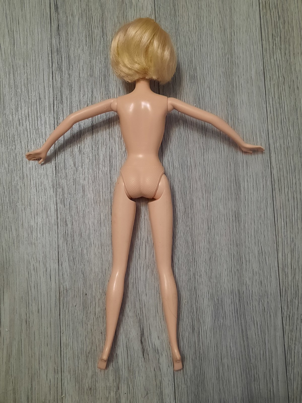 Barbie Mattel, asi z roku 2003/2004. Má gumené nohy, je ohybná v kolenách, rokzročí nohy a upaží ruky.