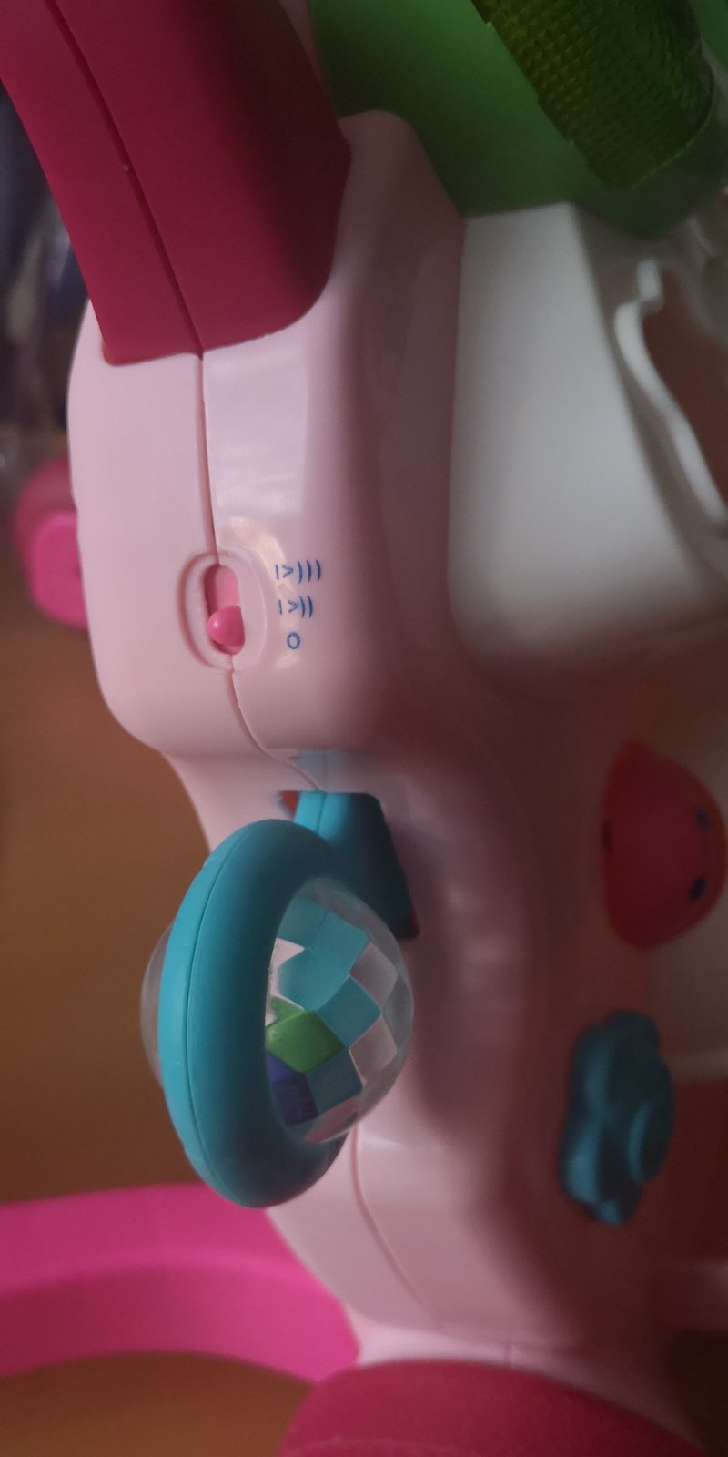 Na ľavej strane hračky je umiestnená hrkálka, ktorá sa pri dotyku dopredu a dozadu pohybuje a hrká.