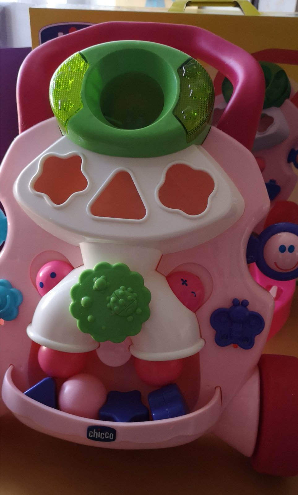 Predám krásne a plne funkčné chodítko Activity 2v1 zn. Chicco. Súčasťou balenia sú 3 ružové guličky a 3 fialové kocky rôznych tvarov.