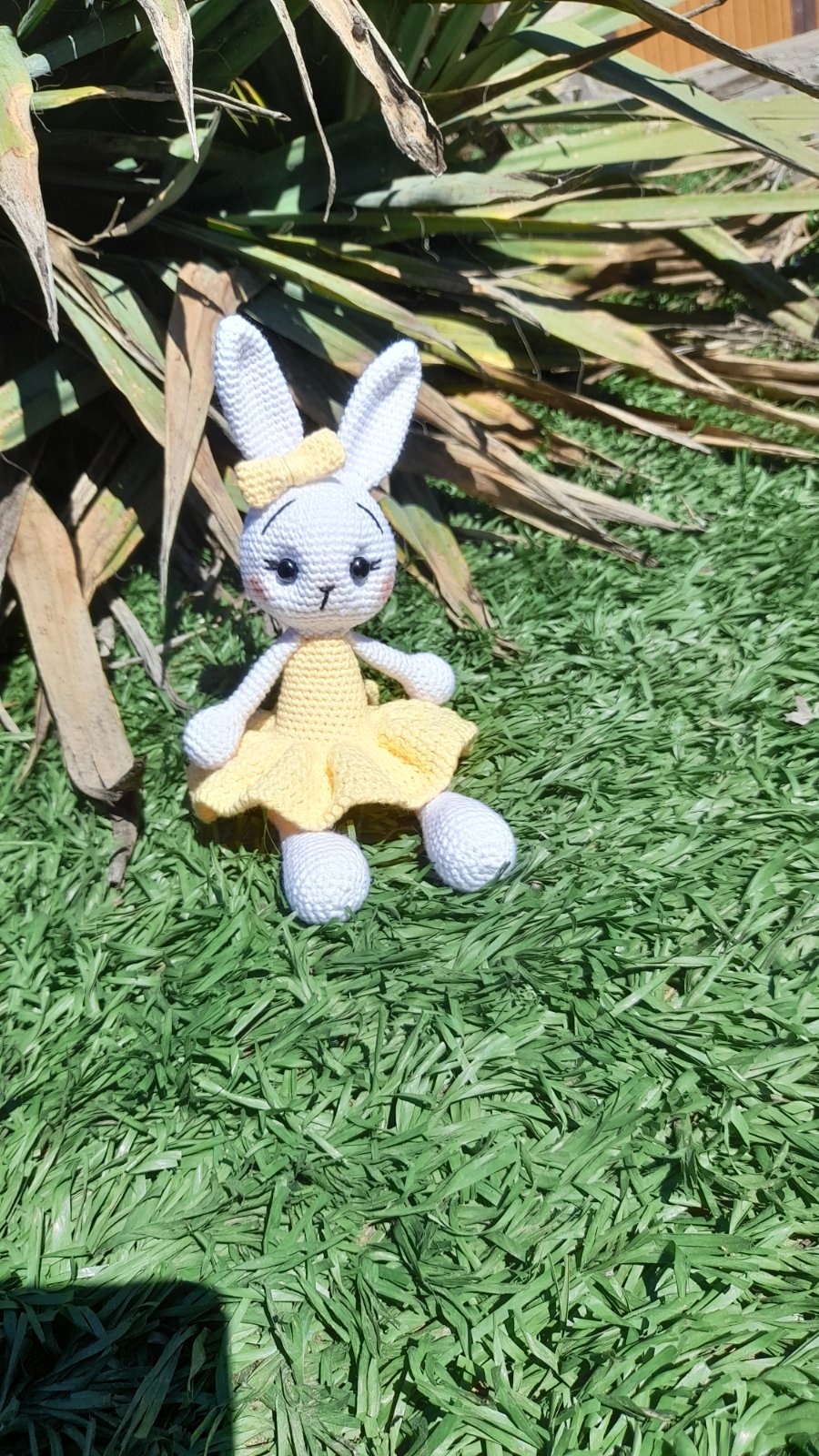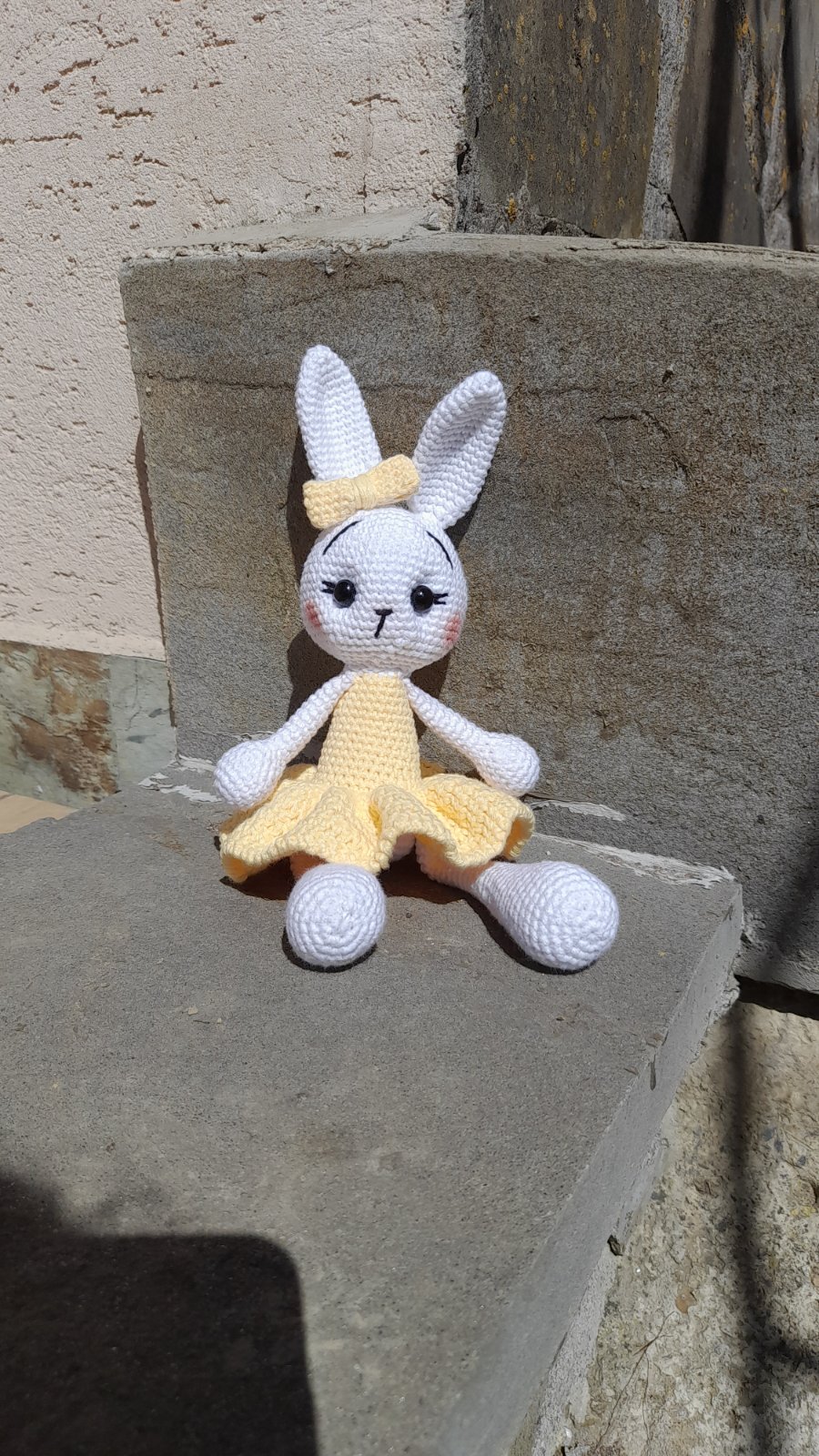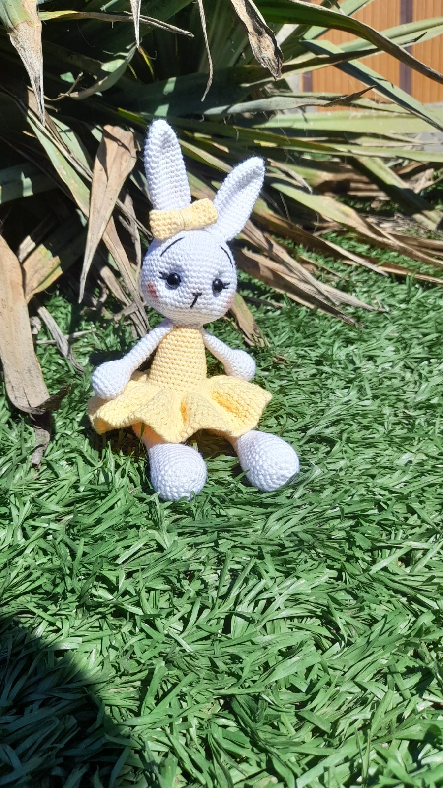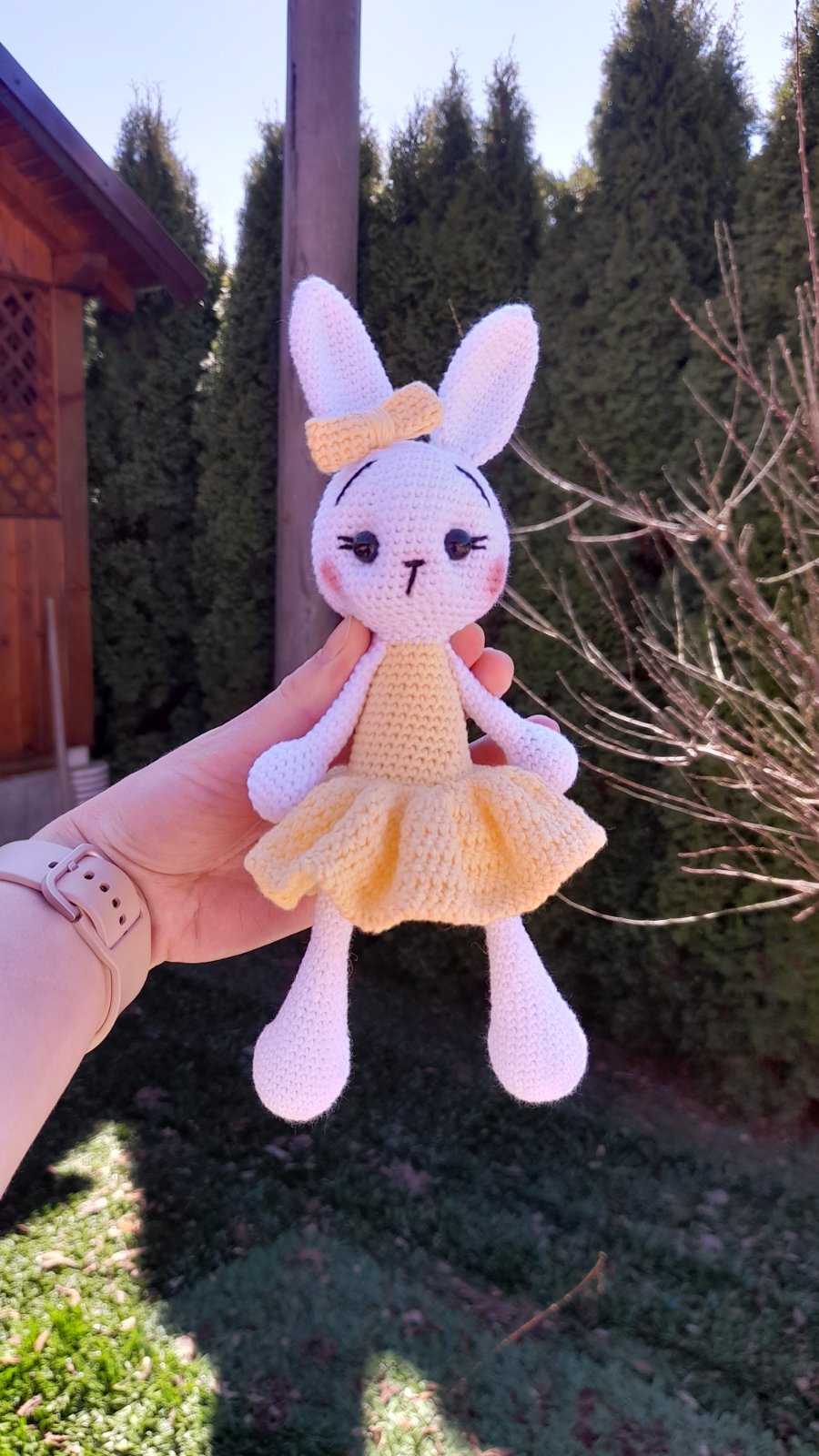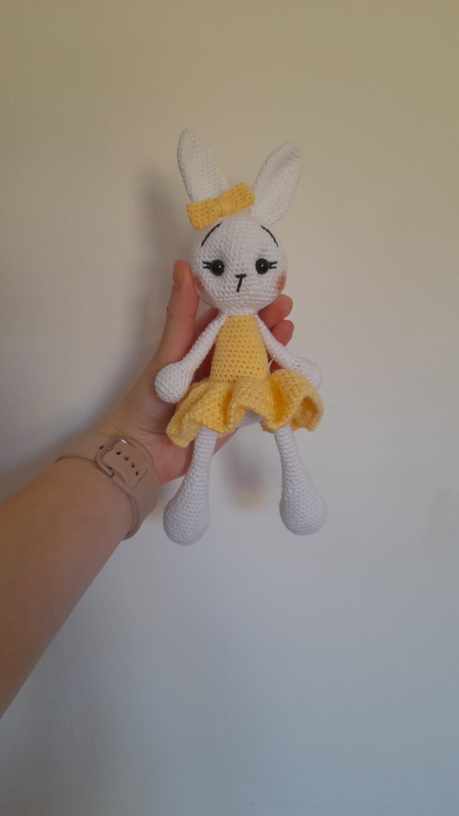 Predám tohto nádherného, mnou ručne háčkovaného zajačika (resp. zajačicu) v krásnych žltých šatôčkach s ladiacou mašličkou na ušku. Zajačik je precízne spracovaný s láskou k detailu – má jemne vytieňované líčka a krásne očká s riasami.