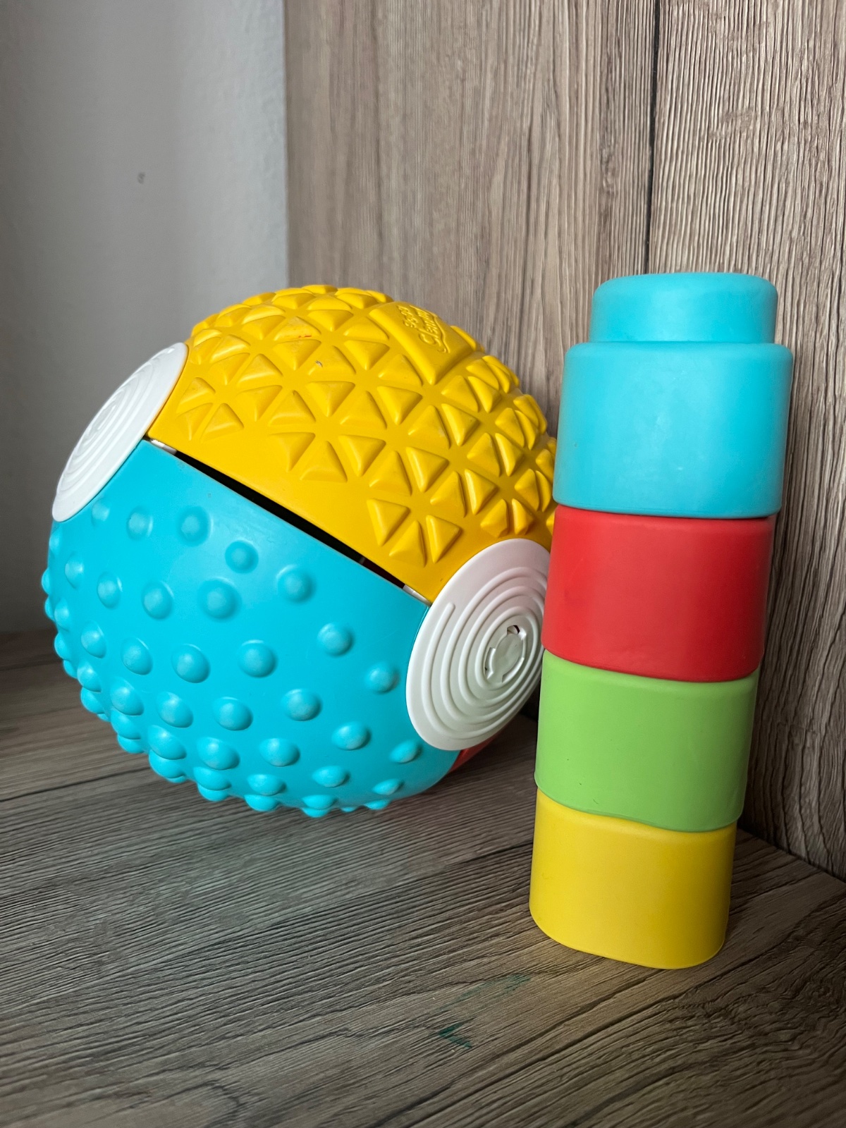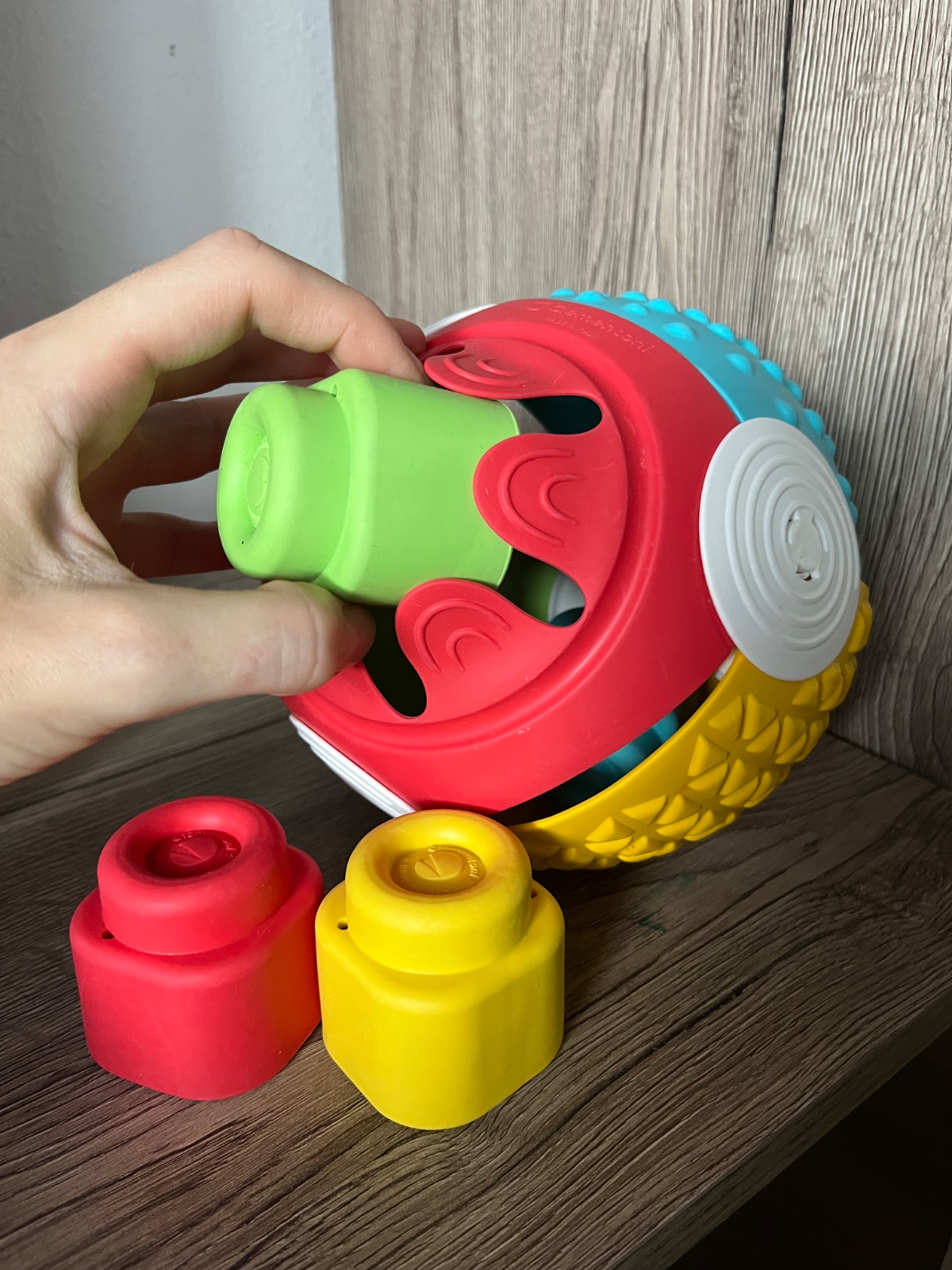 Vkladacia lopta s rôznym povrchom na každej strane, s 5 gumenými kockami. Priemer lopty je cca 17cm. Bez poškodenia vo výbornom stave