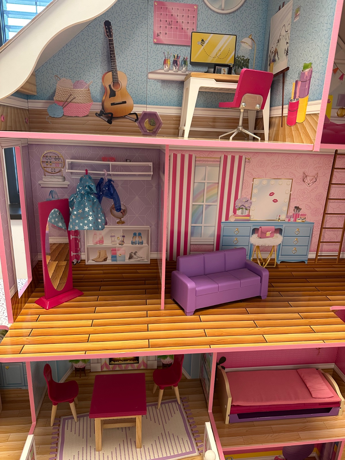 Obrovský štvorposchodový domček s domčekom na strome, balkónmi, výťahom a garážou. Niektoré príslušenstvo so svetelnými alebo zvukovými efektmi. Dominantou je domček na strome, ktorý je osvetlený a útulný. Mnoho zábavných herných prvkov. Minimalne pouzivany. Vhodný pre barbie.