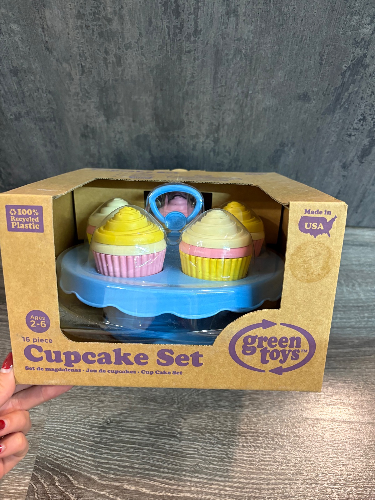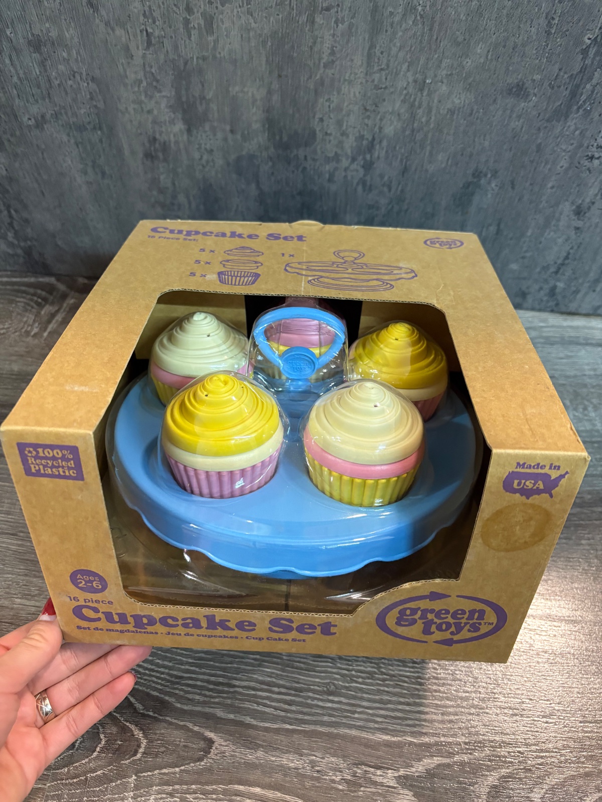 27p7k.Zelené hračky Cupcakes Mmm.... Lahodné cupcakes od Green Toys, to je chutné! Táto súprava cupcakes obsahuje 5 cupcakes a stojan, na ktorom ich možno prezentovať. Táto robustná a odolná hračka je vhodná na použitie v interiéri aj exteriéri. Súprava má rozmery približne 21 cm x 22,2 cm x 14 cm (DxVxŠ) a je vyrobená zo 100 % recyklovaného plastu. Neobsahuje PVC, BPA ani ftaláty a ľahko sa čistí a môže sa umývať v umývačke riadu. Je tiež zabalená v recyklovanom materiáli a potlačená sójovým atramentom. Ideálny pre deti od 2 rokov, aby si mohli zorganizovať vlastnú koláčikovú párty! Ďalšie informácie o výrobku 100% recyklovaný plastCca 21 cm x 22,2 cm x 14 cm (DxVxŠ)Ľahko sa čistí a dá sa umývať v umývačke riaduIdeálny pre deti od 2 rokov