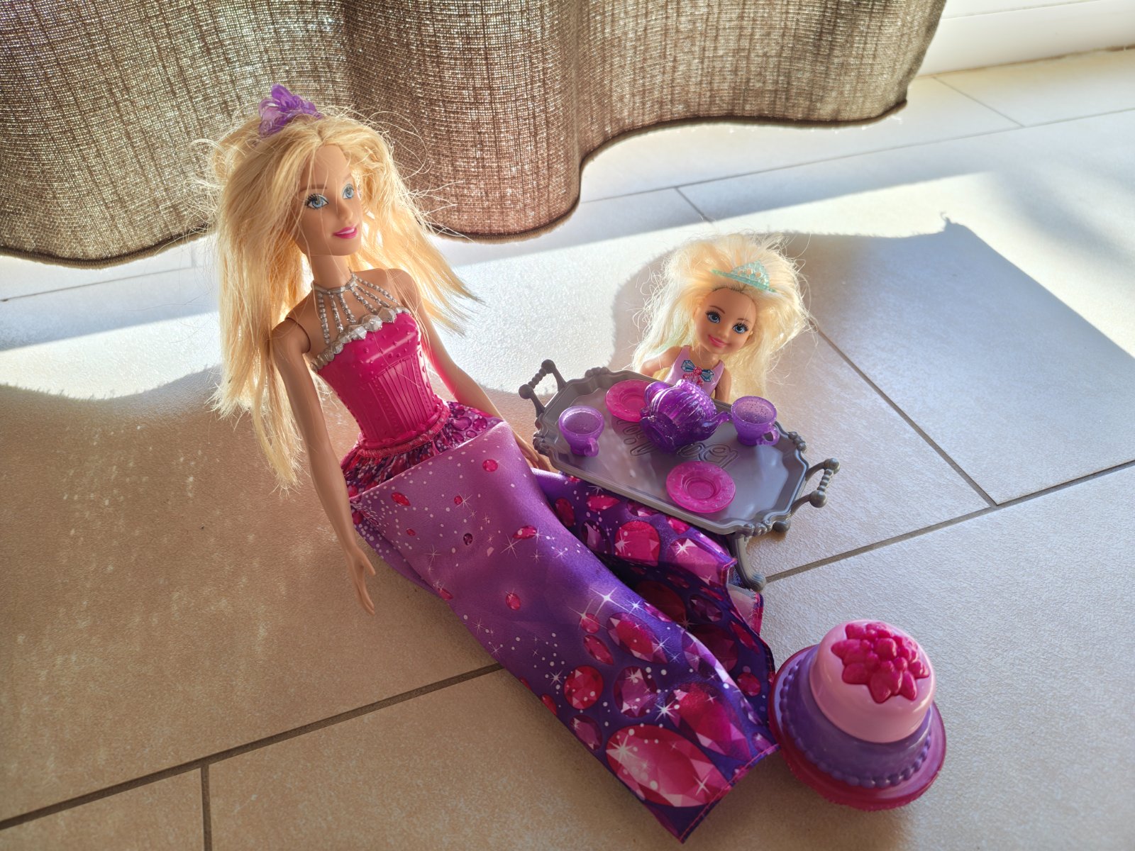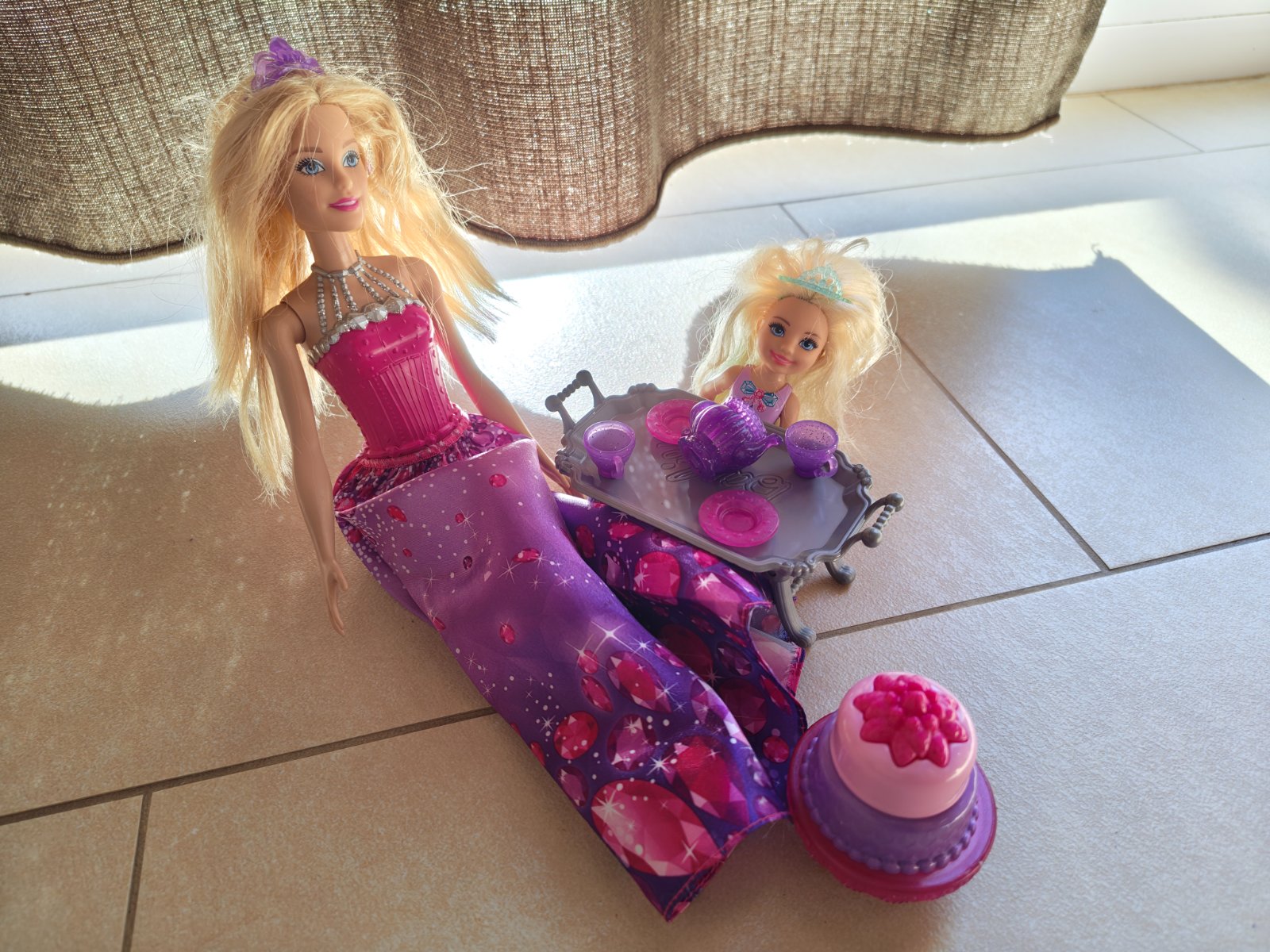 Predám sadu Barbie s dievčatkom, stolíkom, poschodovou tortou a rozličnými doplnkami na stolovanie. Sada je hraná a mierne opotrebovaná, viď fotky.