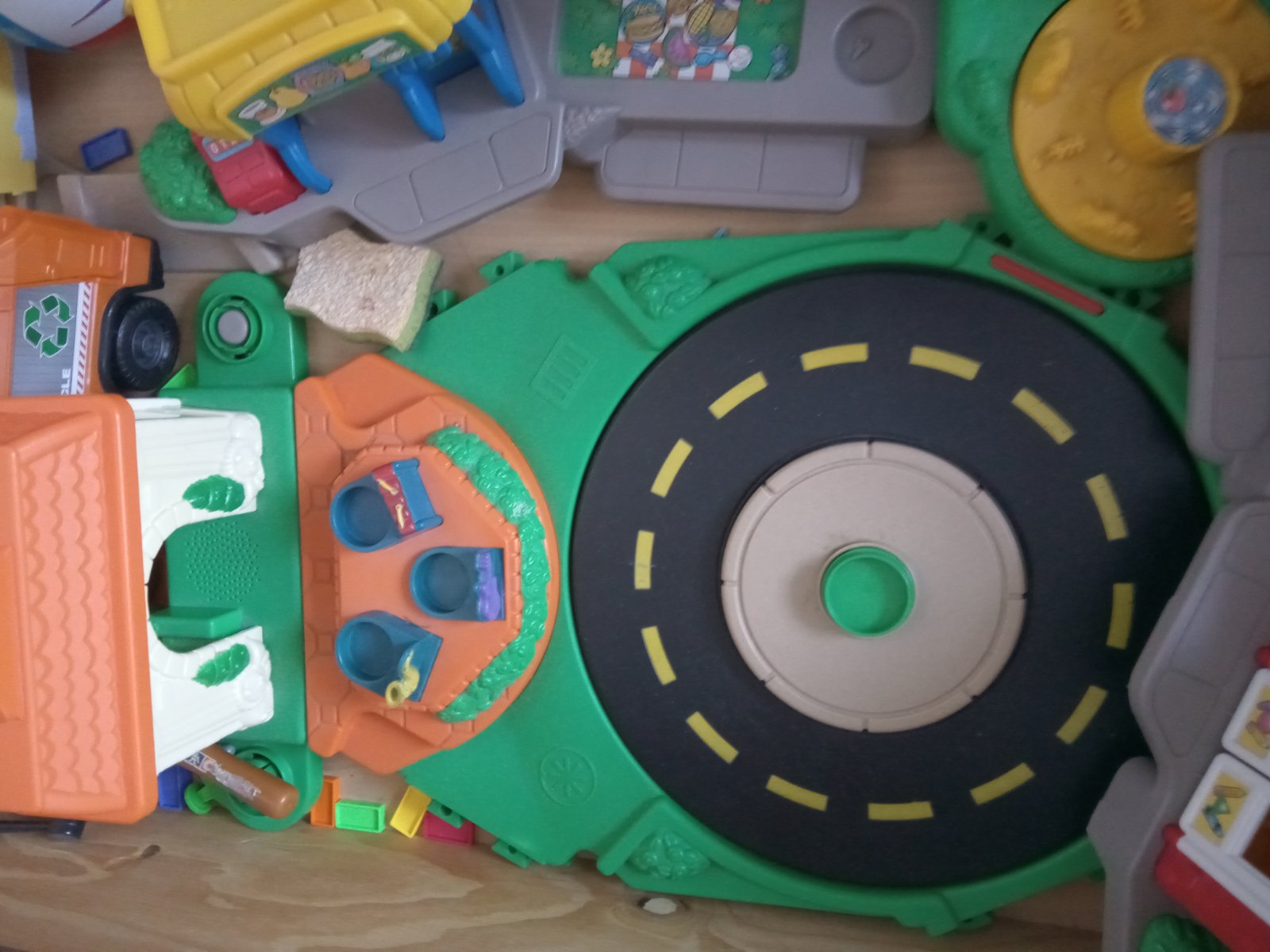 Zvukové mestecko.vsetko funkčné.aj tá čierna cesta sa točí dokola.+postavičky,ploty a ine doplnky. Je tam aj menšia farma so zvieratkami.