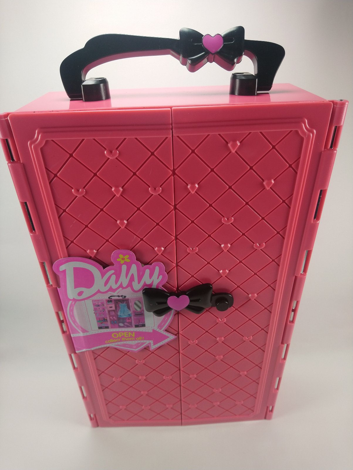 Nový Prenosný módny Šatník, set doplnkov, Daisy je komplet rozkladacia skriňa s rukoväťou a otváracími dvierkami na petlicu. Dá sa pohodlne zavrieť, presunúť a vziať na výlet. Rozkladacia šatníková skriňa na šaty je vybavená dvojkrídlovými dverami so zámkom v tvare mašle, ktoré chránia skriňu pred otvorením.