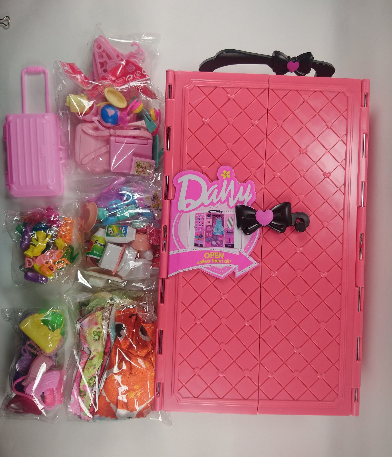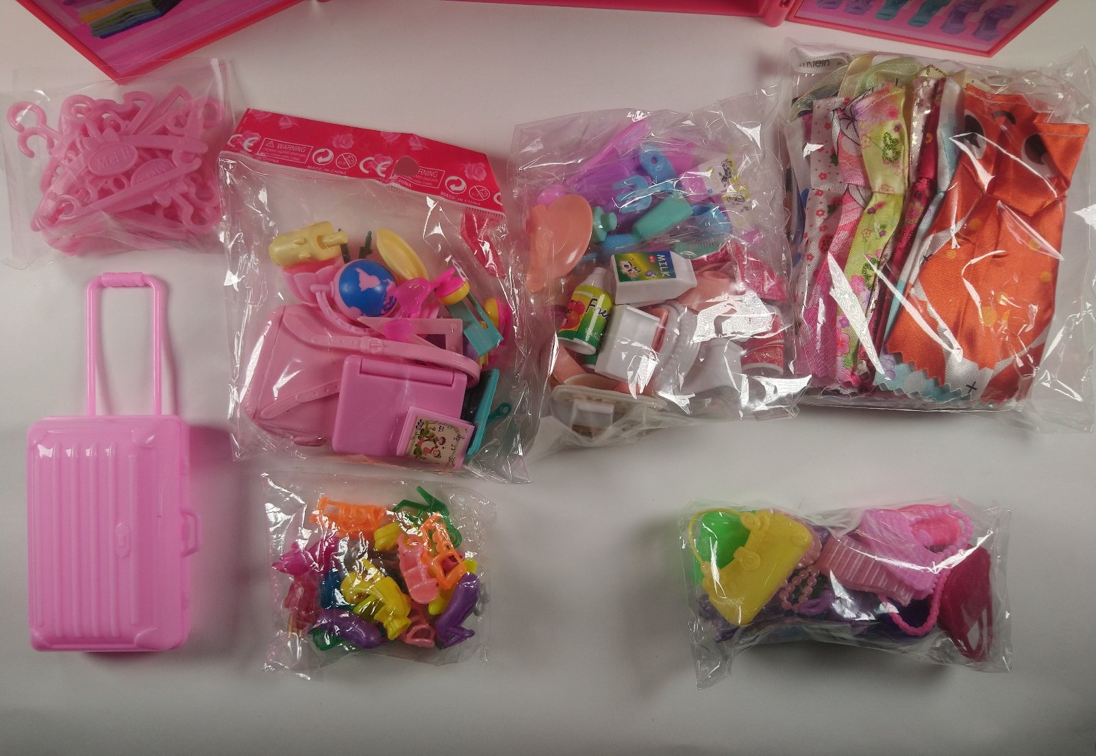 Obsahuje príslušenstvo na obrázku, cestovný kufor, set mini šiat, set vešiakov na šaty, set topánok, set kabeliek set, set riadov a set ostatných doplnkov. Sety sú náhodné varianty, ktoré sa v balení môžu v detailoch a farbách líšiť.