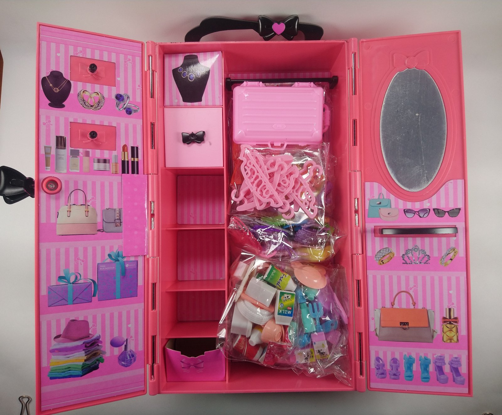 V šatníku na oblečenie pre bábiky je zrkadlo s policou, ako aj knižnica s policami na topánky a doplnky. Rozkladacia skriňa, Šatňa na oblečenie sa veľmi ľahko a rýchlo rozkladá. Stačí zdvihnúť zámok a otvoriť dvere.