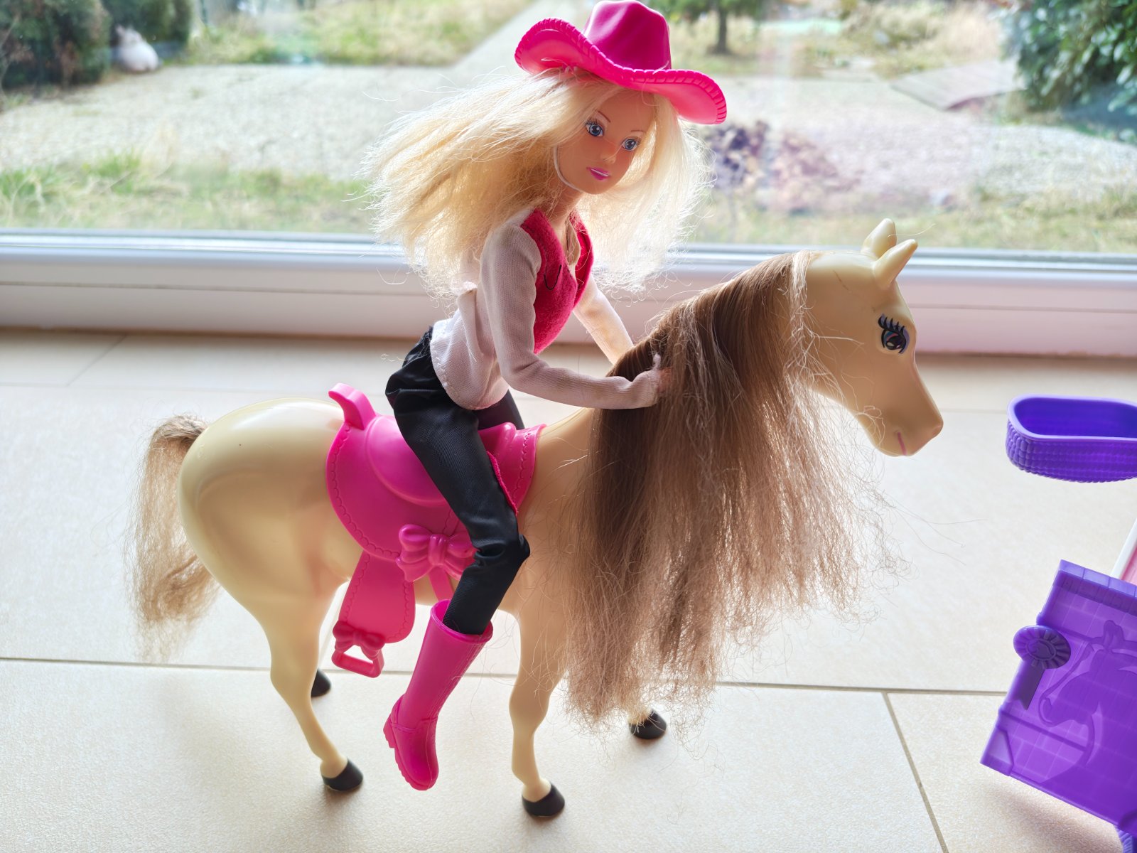Predáme stajňu s koníkom a bábikou. Je to komplet značky Simba Toys, plne funkčné. Dvierka sa dajú otvárať a ohrádka sa dá rôzne skladať. Taktiež sedlo, bičík, aj bábika sa dá prezliekať. Bábika je super ohybná, dá sa posadiť na koňa. Celá sada je bežne opotrebovaná (žiadne zlomené diely). Hračka je veľmi čarovná pre dievčatá.