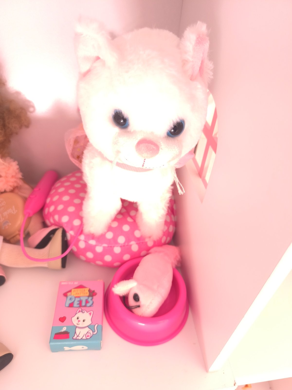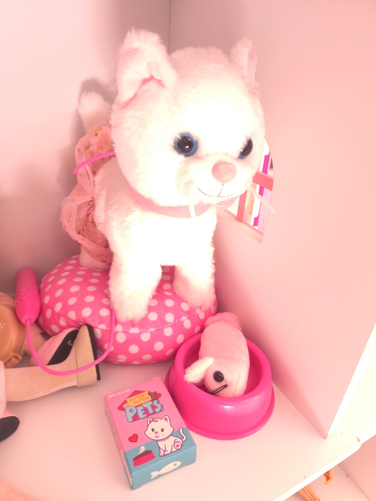 K mačke je pelech, miska, myš, krabička ( akože granule), hrebeň.