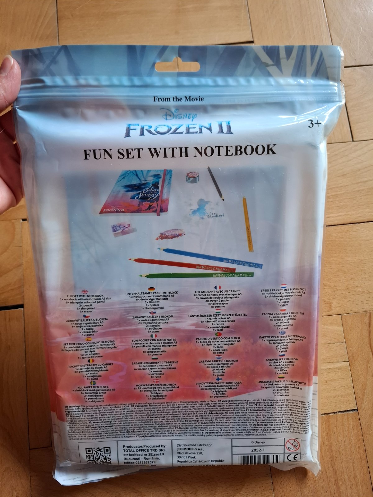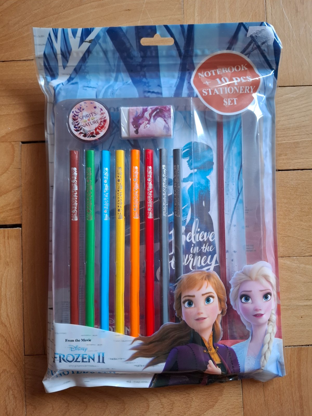 Predám nový set Frozen II, obsahuje Zápisnik s gumičkou, 8 ceruziek, strúhadlo a gumu.