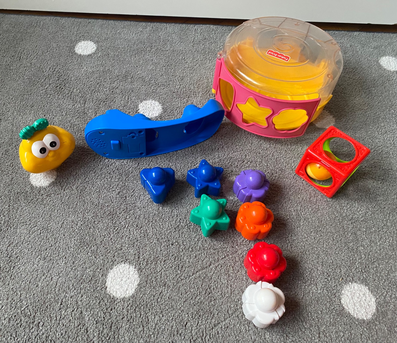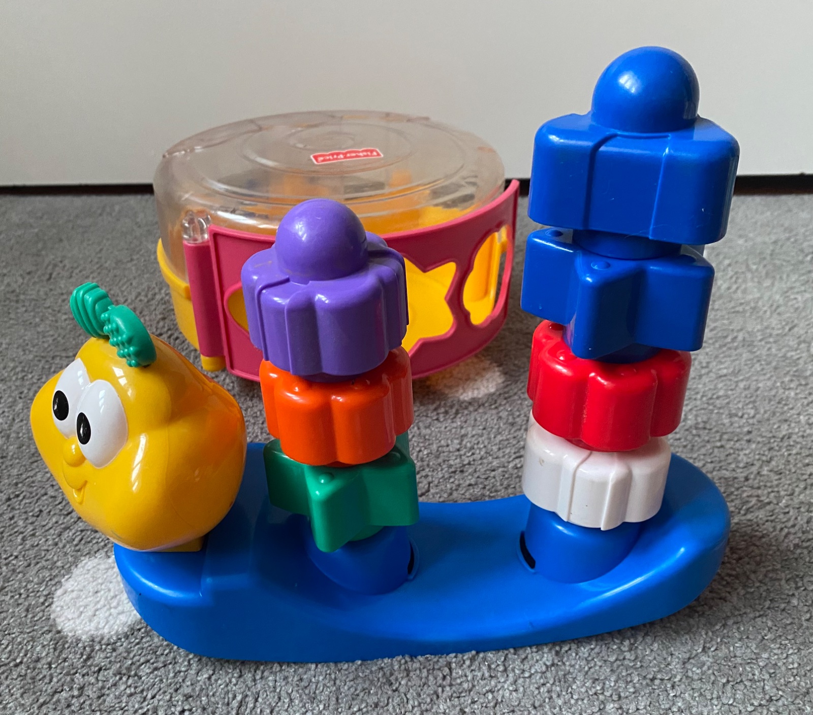 Pekný hraný stav. Zo spodu je gombík, ktorý keď sa zatlačí, tak hračka vydáva melódiu. Z vkladačiek sa môže poskladať aj piramída.