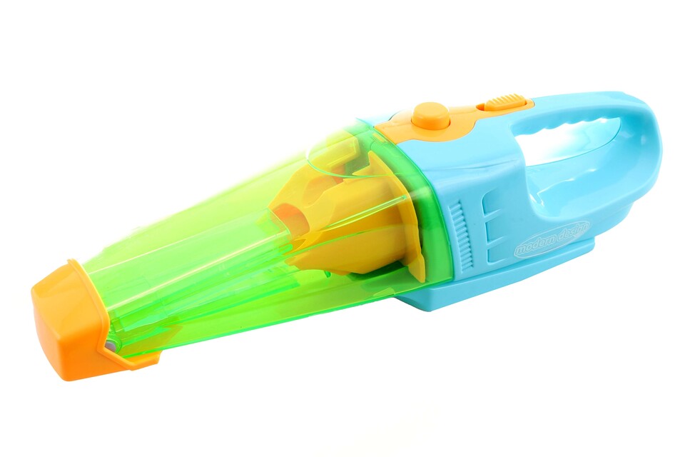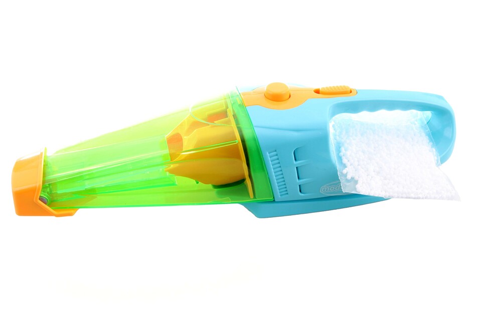 Ručný vysávač na batérie. Vysávač vydáva reálne zvuky, svieti a saje. Súčasťou balenia sú polystyrenové guličky.