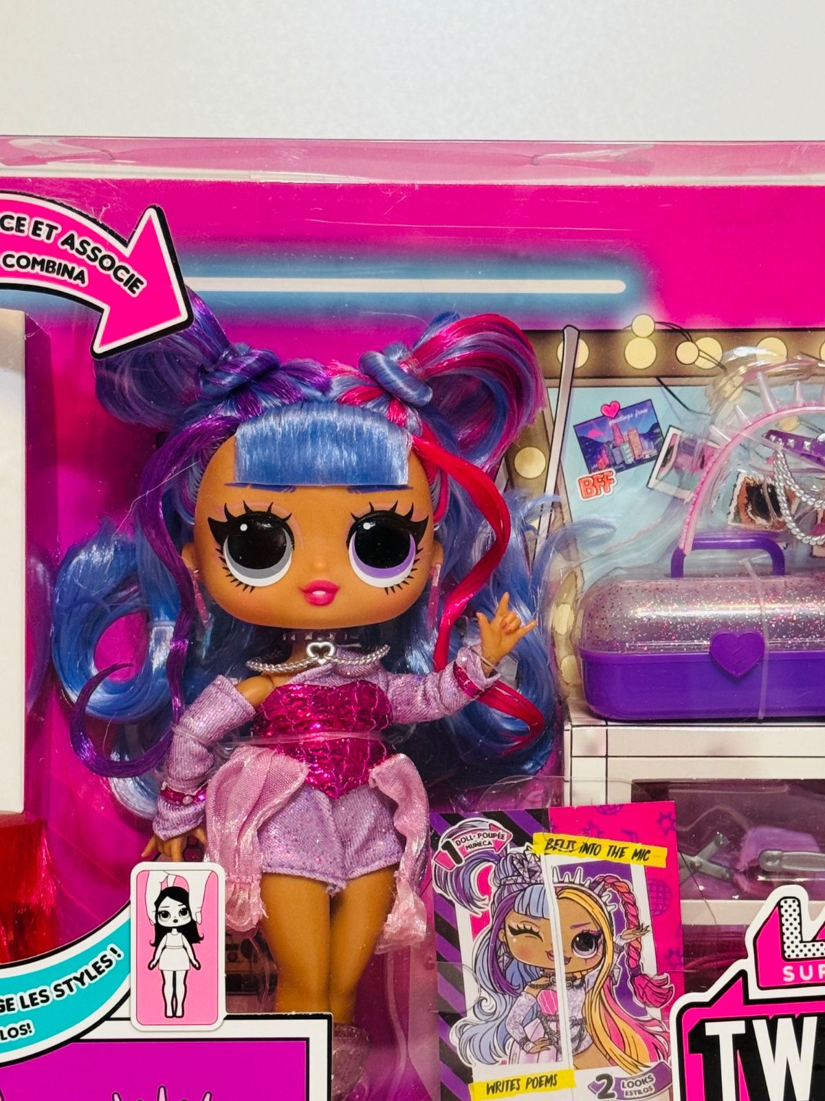 Zmeňte vzhľad Bailey v okamihu tým, že jej modrý, fialový a ružový účes vymeníte za neónovo purpurovú a oranžovú stylingovú hlavu, ktorú možno jednoducho pripevniť na telo bábiky. Potom jej rýchlo vymeňte oblečenie a vymeňte jej doplnky vrátane čelenky, vlasových doplnkov a d'alších 20+ PREKVAPENÍ vrátane stylingovej hlavy, báječnej módy, topánok, kaboodle, opasku, náhrdelníka, doplnkov na úpravu vlasov, kefy na vlasy, stojana na bábiky a d'alších!