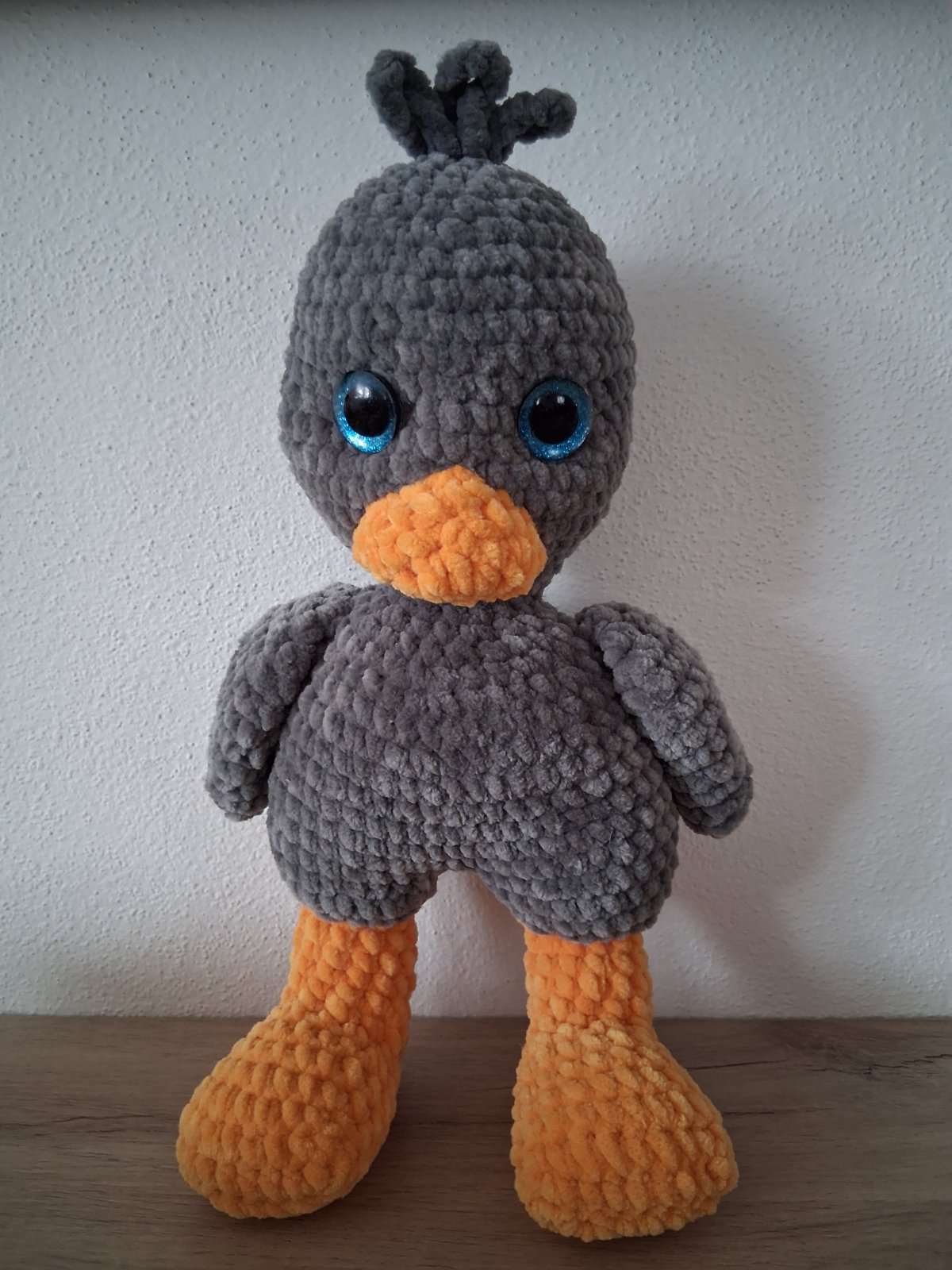 Háčkovaná kačička z príjemnej priadze, vyplnená dutým vláknom, výška 30cm, s bezpečnostnými očkami.