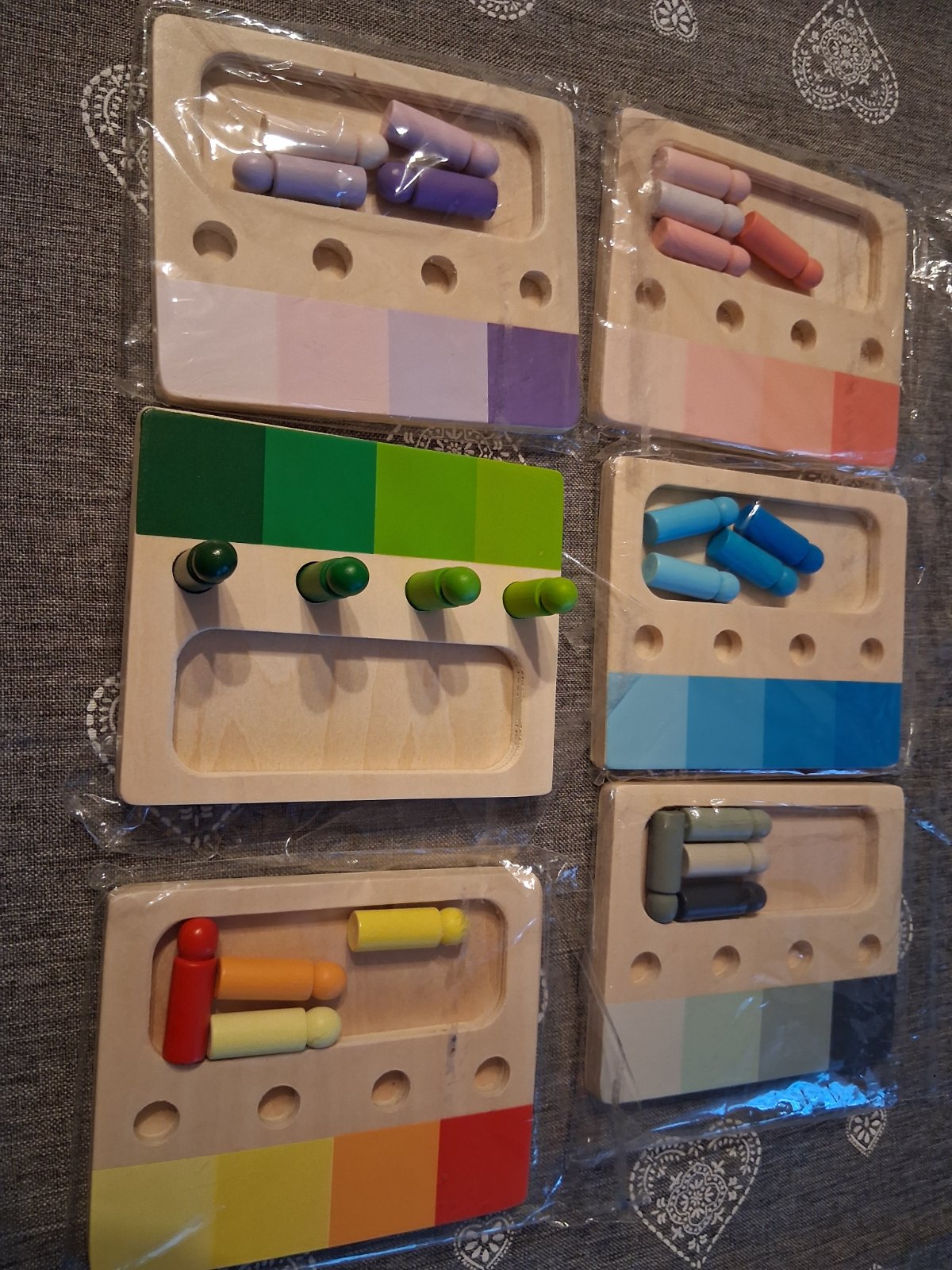 foto navliekacka Melissa a Doug, vidno osuchanie 7 eur,navliekacka Jouecco 7 eur, triedenie kluciky po 4 eura, vkladanie minci na trenovanie prstekov 3eura, ostatne 2,50