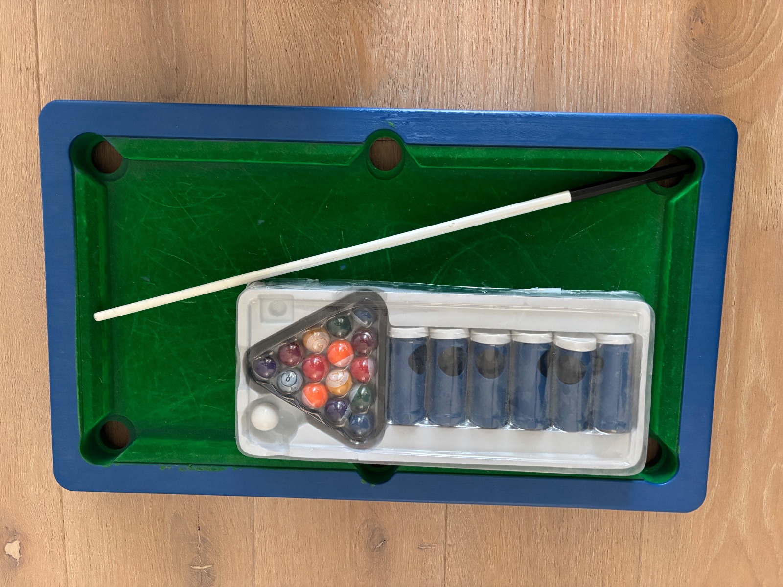 Detský stolný biliard na nožičkách v používanom stave, ale stále je možné sa s ním hrať a zabávať.