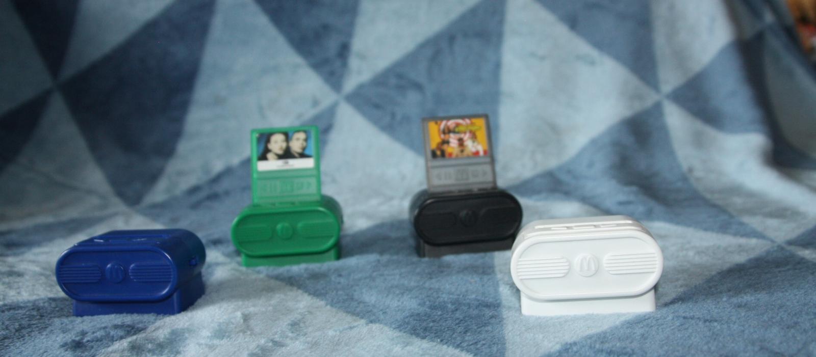 4 radijka v HappyMealu - len to co je na foto. Cierne hra pesnicku The Black Eyed Peas - I Gotta Feeling, zelene 2 UNLIMITED - No Limit, v modrom je vybita baterka tak neviem co hralo a biele hra Beyoncé - Halo, ale chyba ta vrchna cast, tak treba niecim zvrchu zatlacit gombik aby hralo ( nie su navzajom kompatibilne, kazde ma ten cudlik na inom mieste).