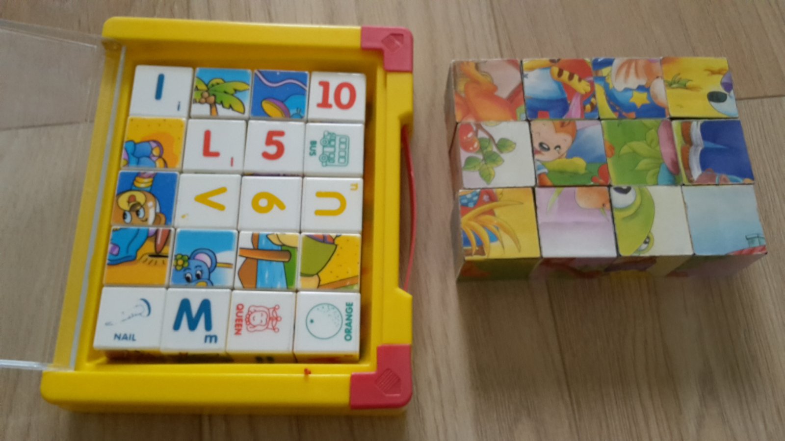 + druha sada plastovych kociek obsahuje dva velke obrazky + pismenka abecedy + zakladne cisla + jednoduche slova v anglictine s obrazkami