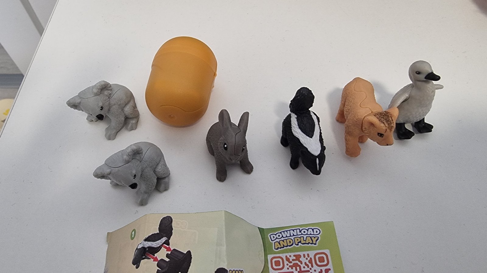 Predám figúrky z kinder vajíčok Natoons, 2x koala, skunk, tigrík, labuť, zajko 2x jeden vo vajíčku jeden vytiahnutý. Všetky nehrané len postavené (teda okrem zajka, ktorý je vo vajíčku). Papierik mám len k skunkovi a tigríkovi a zajkovi vo vajíčku. Cena kus 0.50€