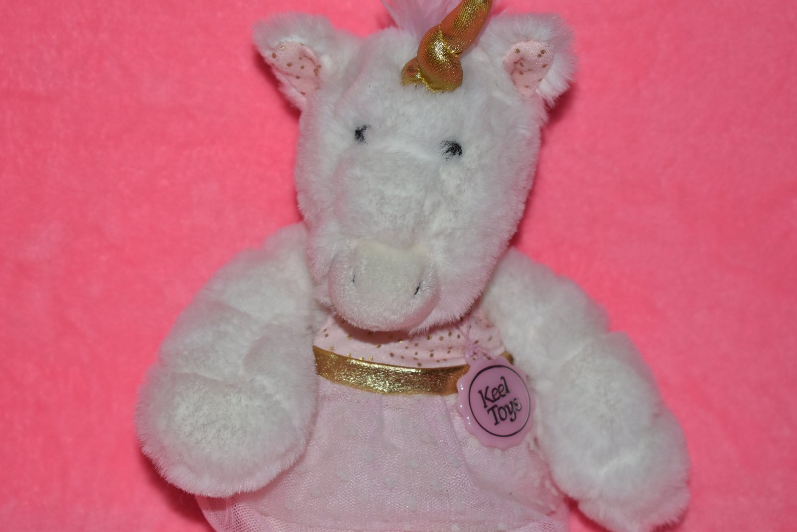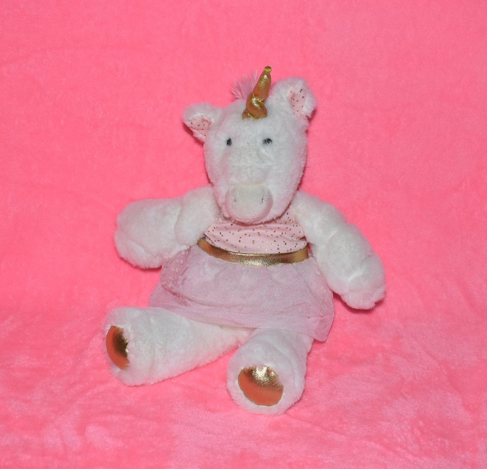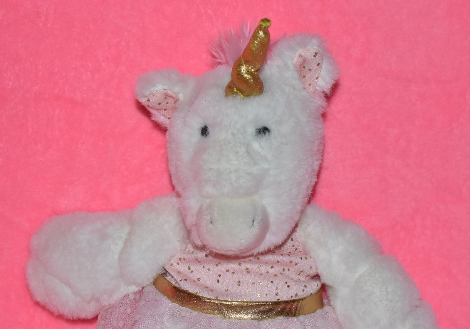 Jednorožec pre dievčatko má jemnú základnú farbu, ružové šaty s tylovou sukňou na ktorej je viditeľný konfetový vzor.