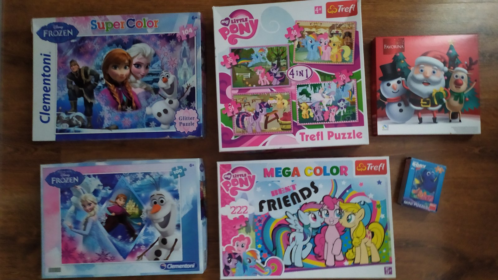 Všetko spolu 4€.Puzzle sú kompletné,okrem veľkých poníkov,v tých chýba jeden dielik,viď foto.