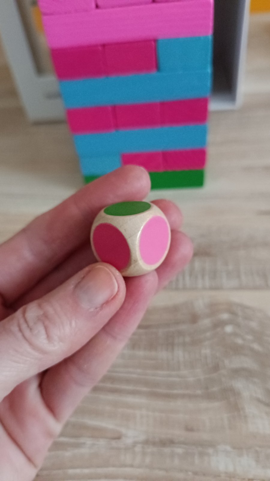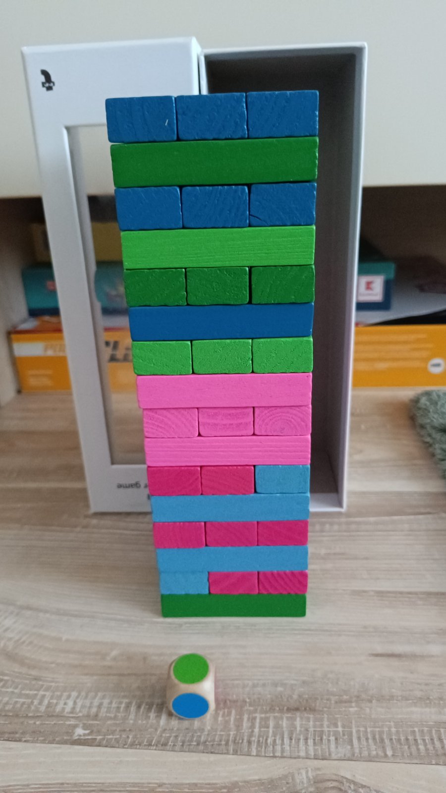 Postavte zo všetkých kvádrov vežu a potom vyťahujte jeden kváder za druhým a dávajte ich hore, aby ste vežu ešte zvýšili. Táto farebná drevená stohovacia hra je ideálna na vytvorenie skvelej zábavy pre deti aj dospelých. Kvádre sú k dispozícii v 6 farbách, ktoré zvyšujú zábavnosť hry. Kocka rozhoduje o tom, ktorá farba sa vytiahne ako ďalšia a umiestni sa na vrchol. Čiže podľa farby, ktorá ti padne na kocke, takej farby kváder musí hráč opatrne vytiahnuť a položiť na vrch veže tak, aby veža nespadla.