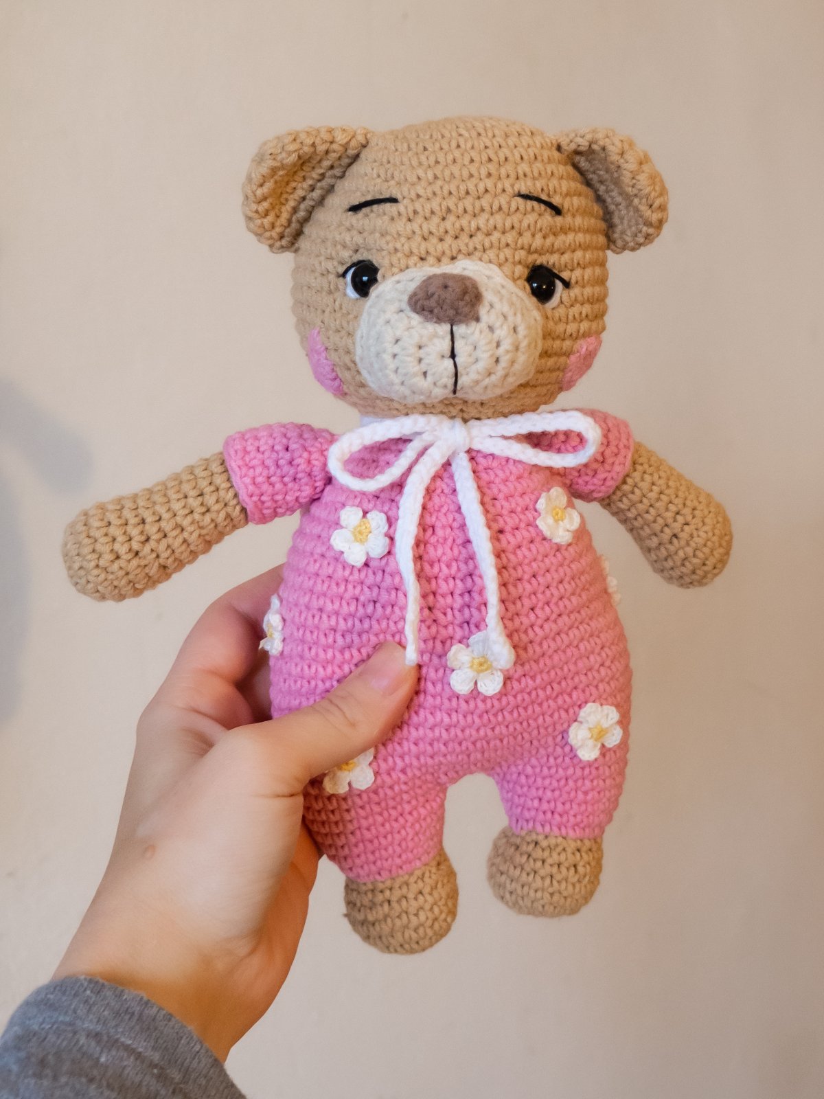 Háčkovaný medvedík z mojej tvorby, veľkosť cca 25 cm. Použitá zmesová priadza Jeans, bezpečnostné očká, vankúšová výplň.