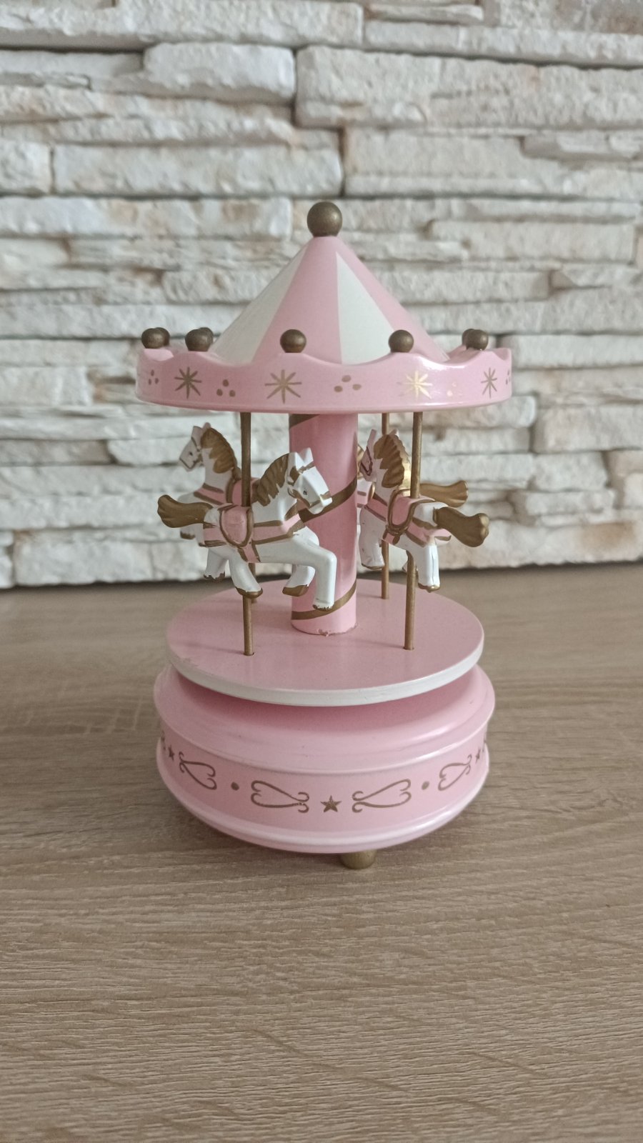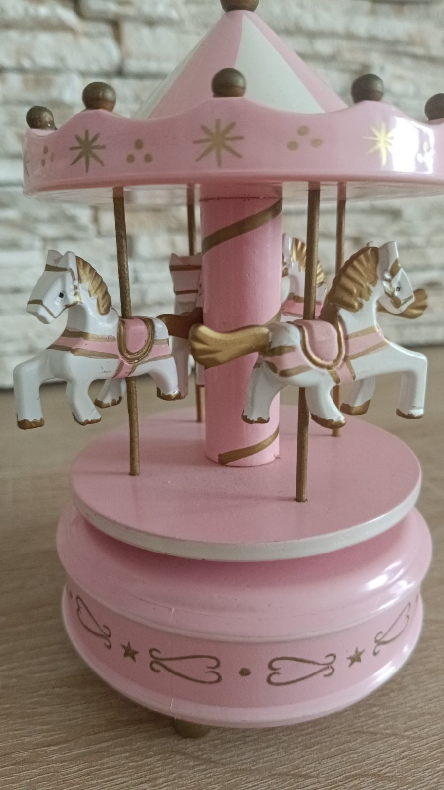Predám krásnu hraciu skrinku v podobe kolotoča s hojdacími koníkmi v ružovej farbe. Je to veľmi milá dekoračná hračka. Po natiahnutí spodnej časti kolotoča sa horná časť kolotoča s koníkmi začne točiť, až kým hudba neprestane hrať.