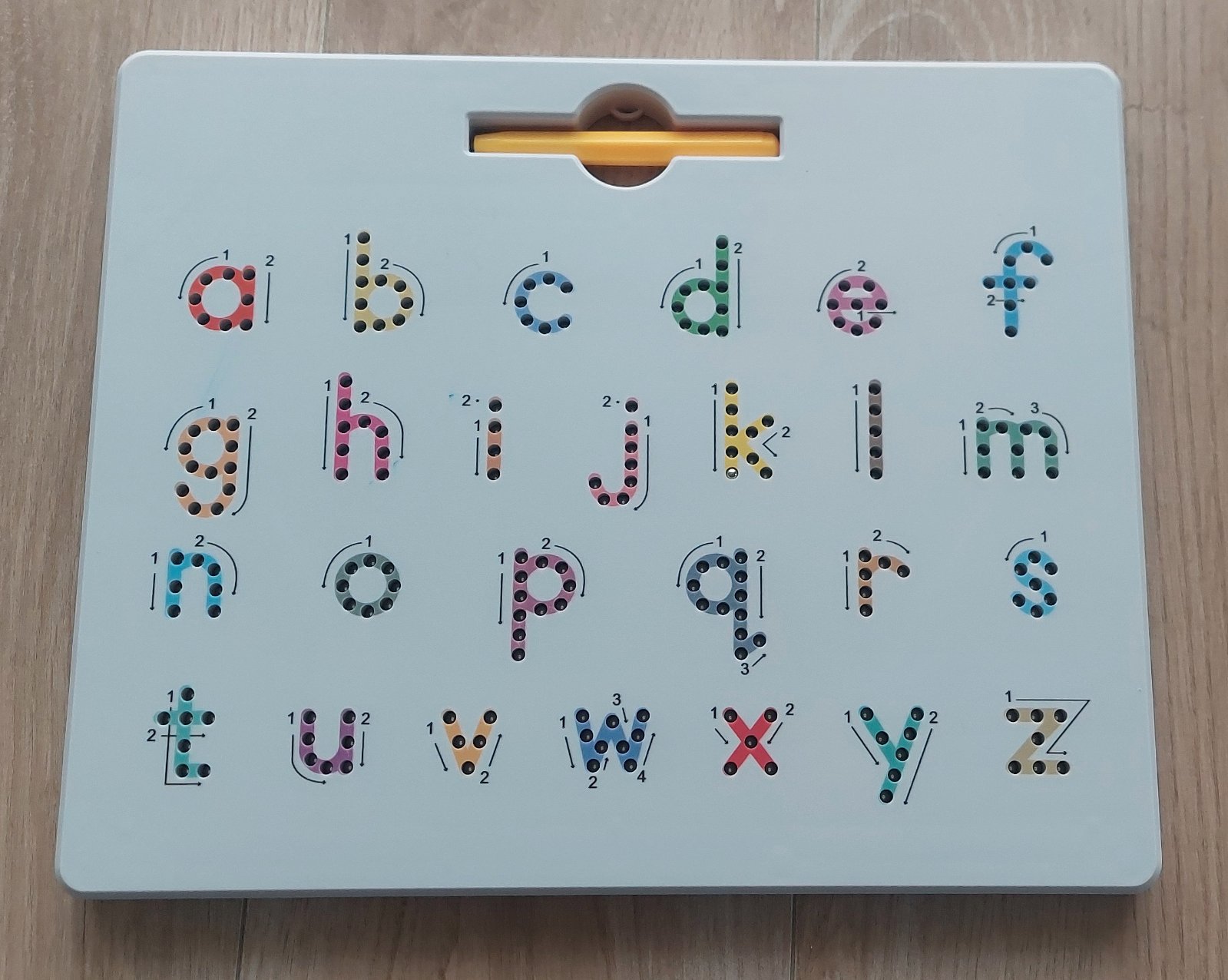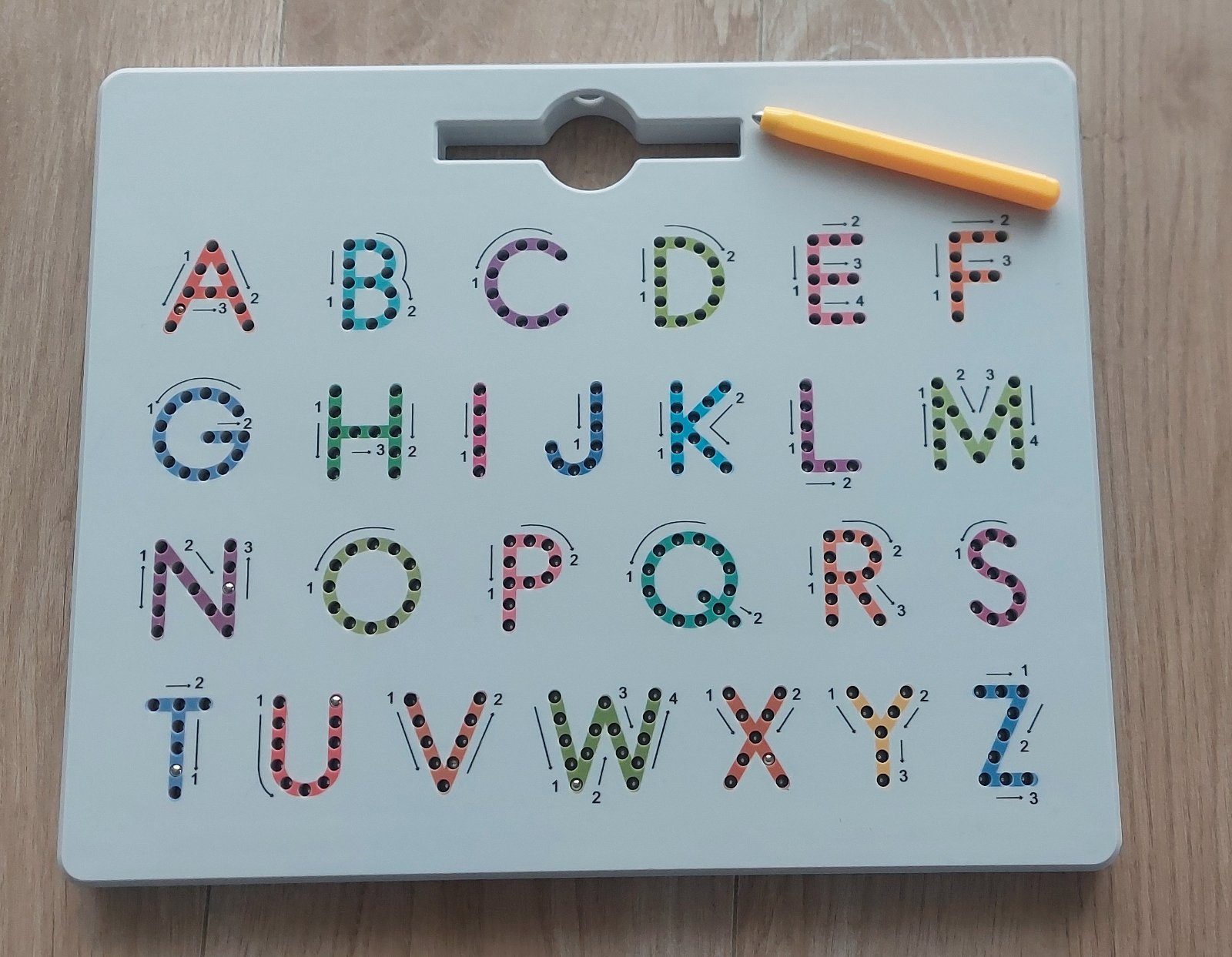 Magnetická tabuľa na učenie sa písania malých a veľkých písmen. Perom s magnetom obkresľujete písmená, v ktorých sú kovové guličku, ktoré magnet prechádzaním vytiahne k povrchu (guličký nevýjdu celkom von, len sa zobrazia pri povrchu).