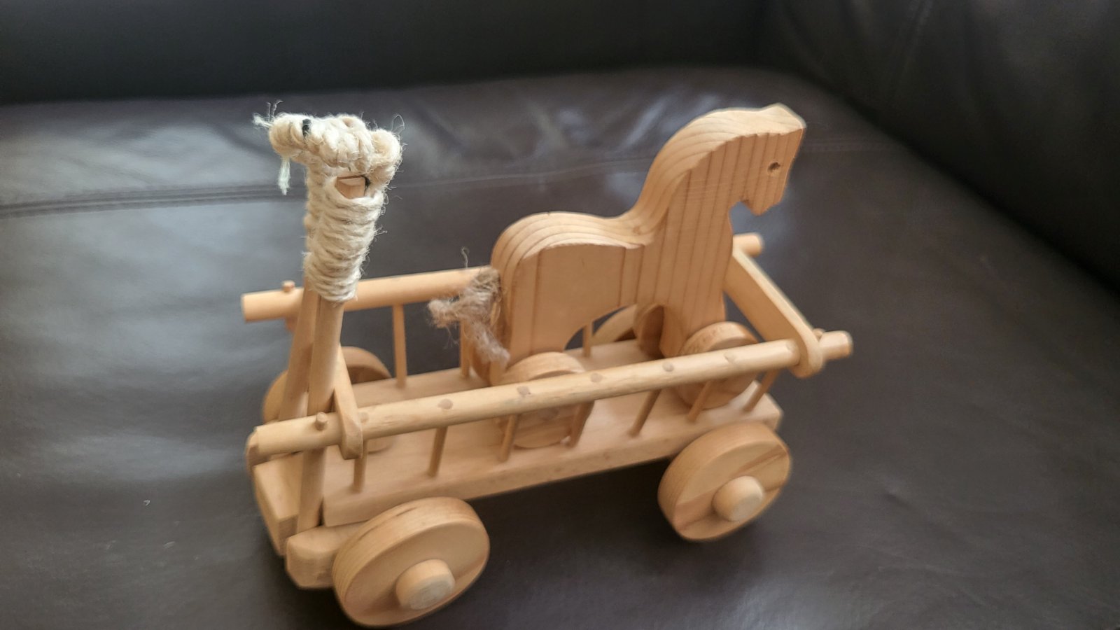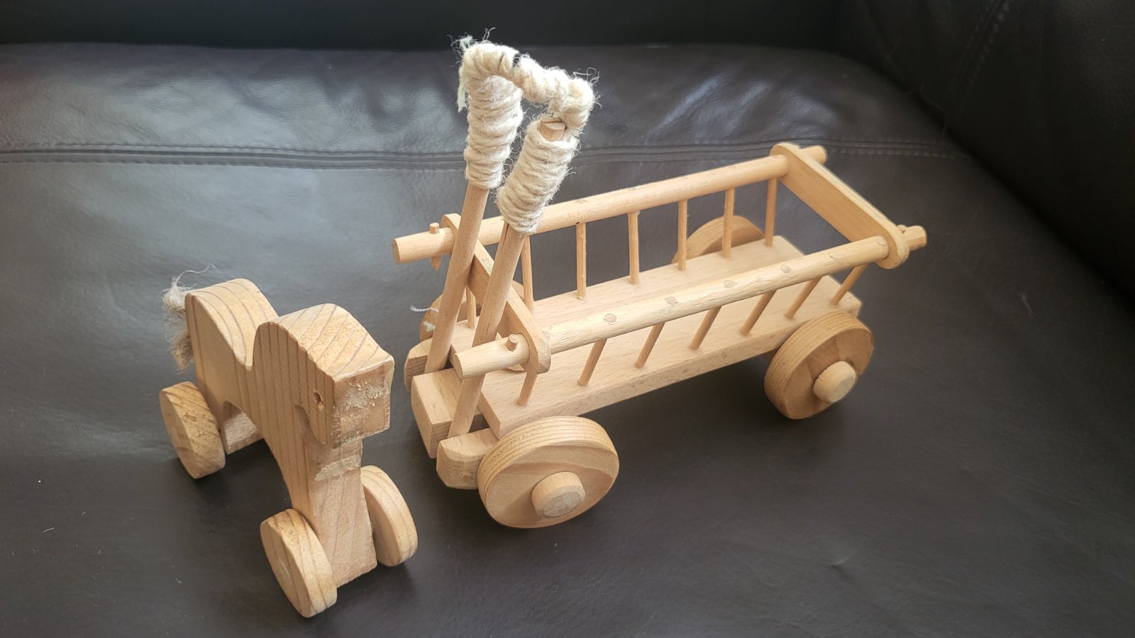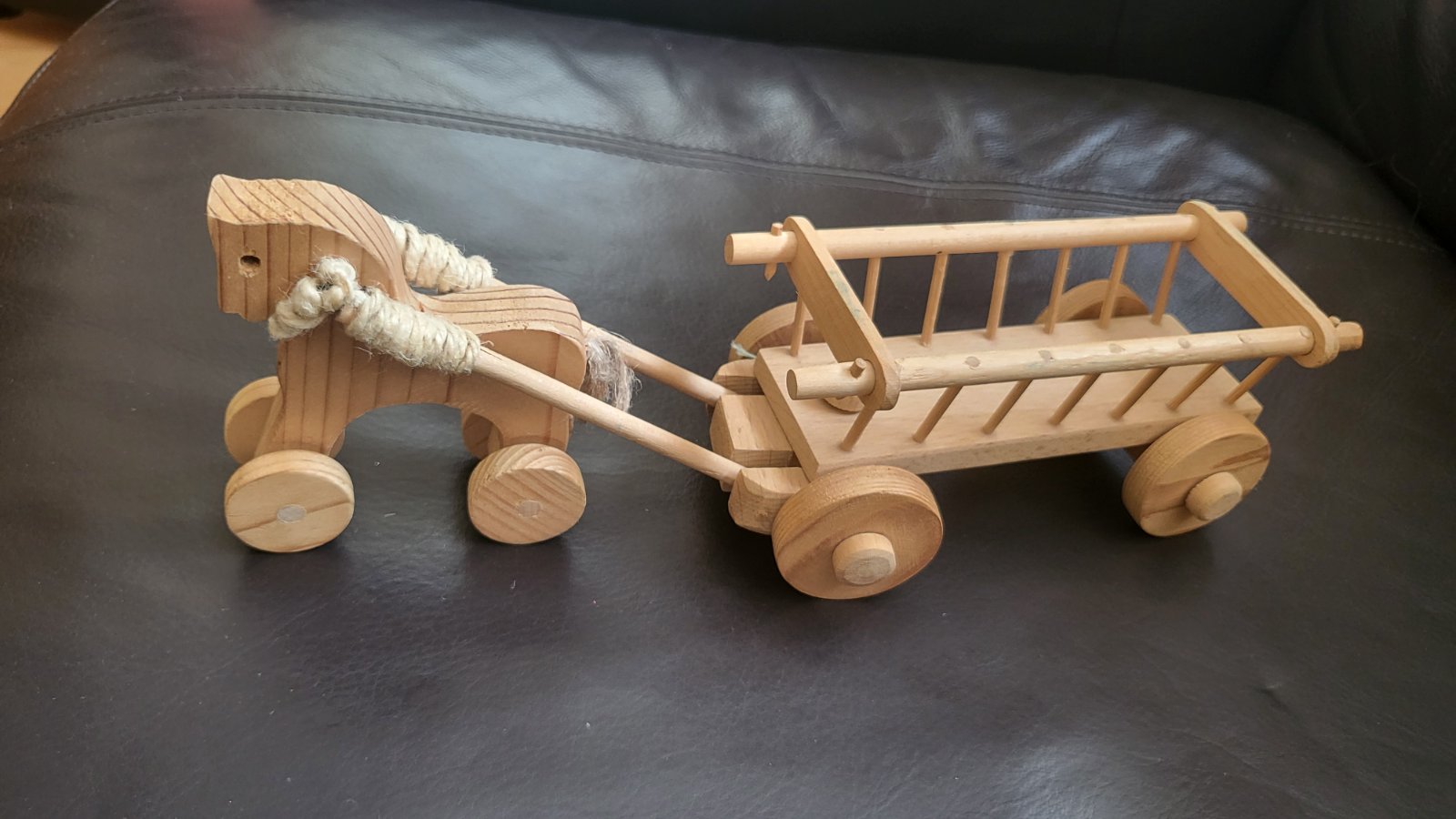 Drevený koník s vozom. Voz dlhý 16 cm, koník cca. 9 cm na kolieskach. Posielam po prevode na účet s podacím lístkom na sledovanie zásielky. Poštovné a balné v cene.