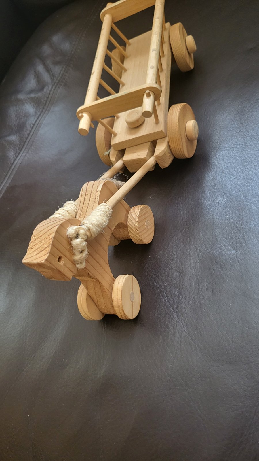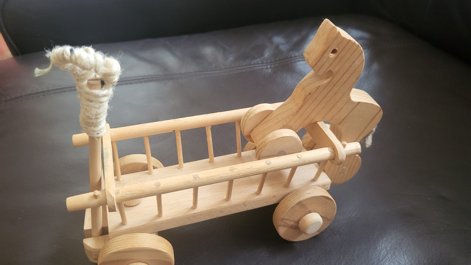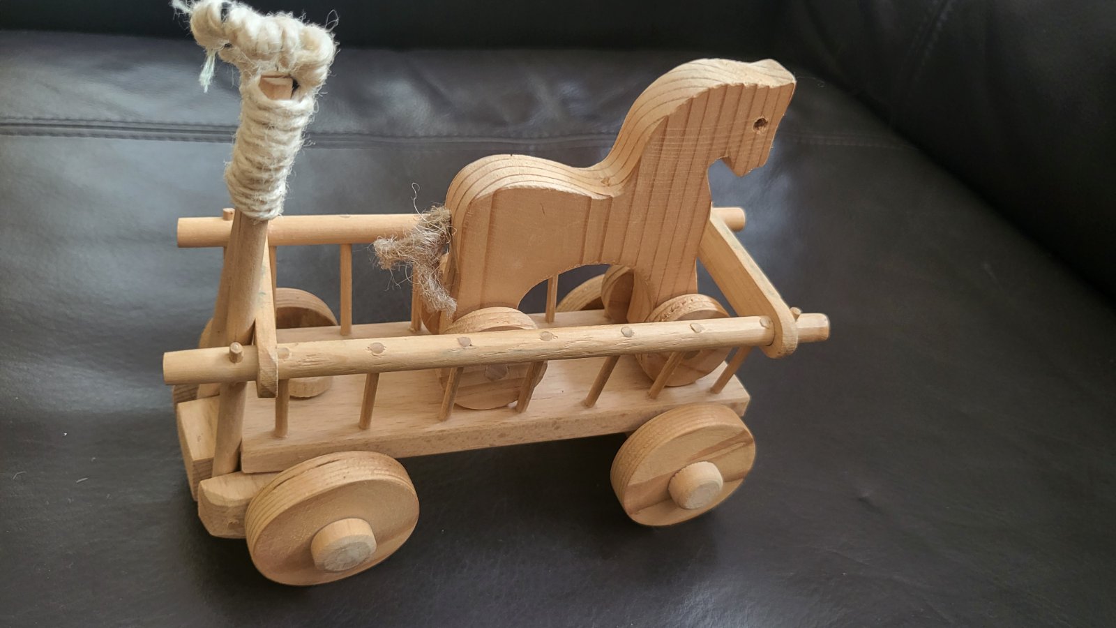 Drevený koník s vozom. Voz dlhý 16 cm, koník cca. 9 cm na kolieskach. Posielam po prevode na účet s podacím lístkom na sledovanie zásielky. Poštovné a balné v cene.