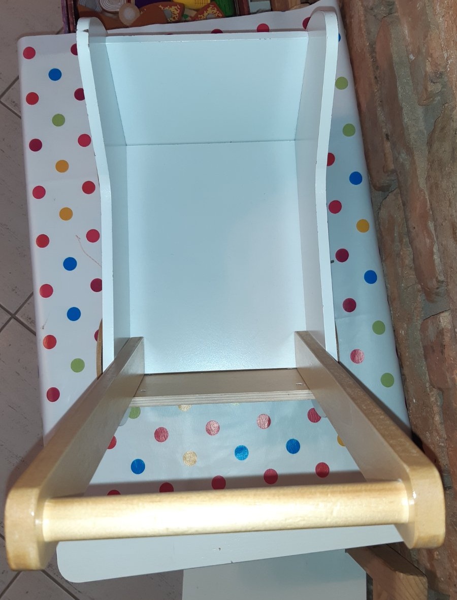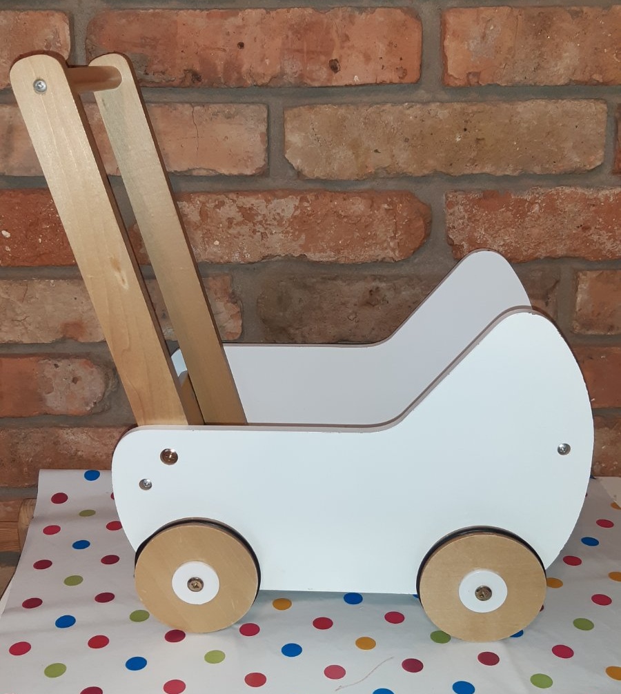 Drevený kočík po dcérke hraný málo. Bežne známky používania .Dobrý ako choditko. Výška 40.5 -41 cm rukoväť.
