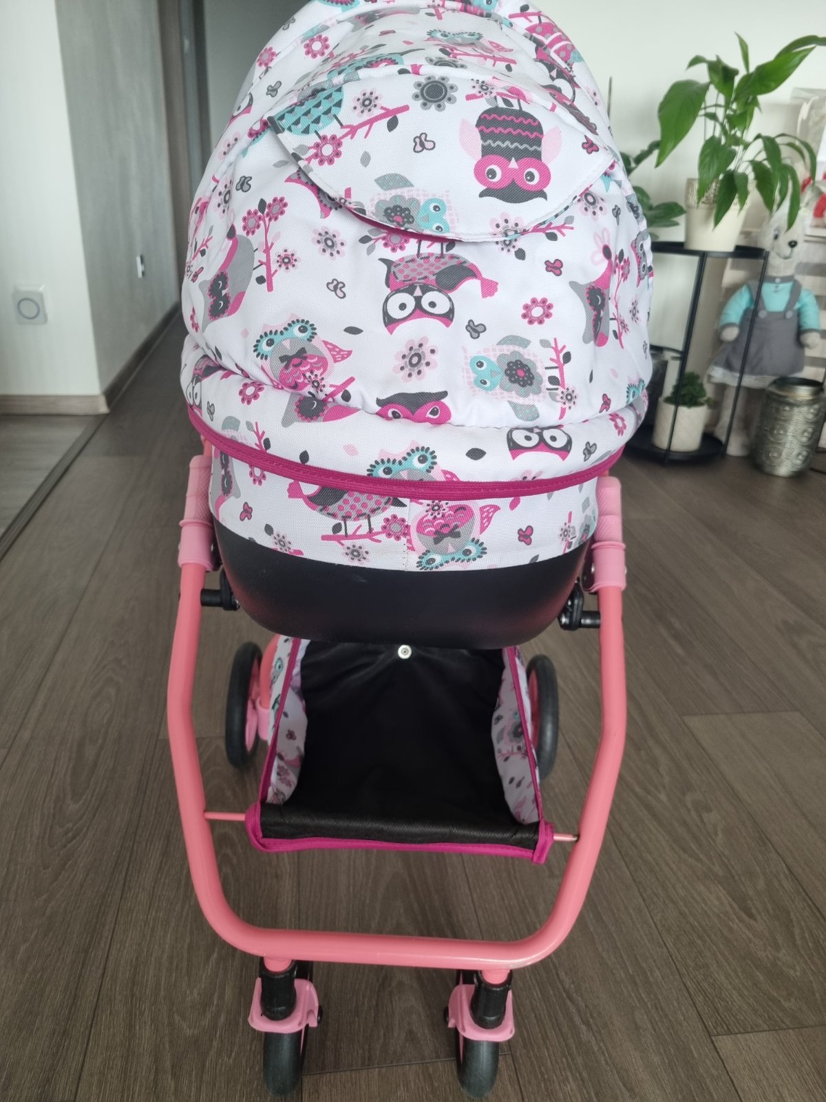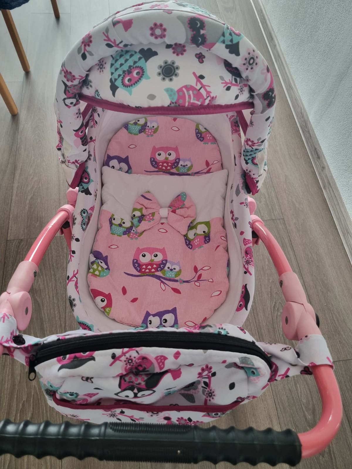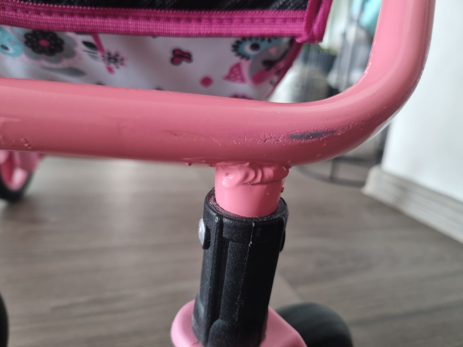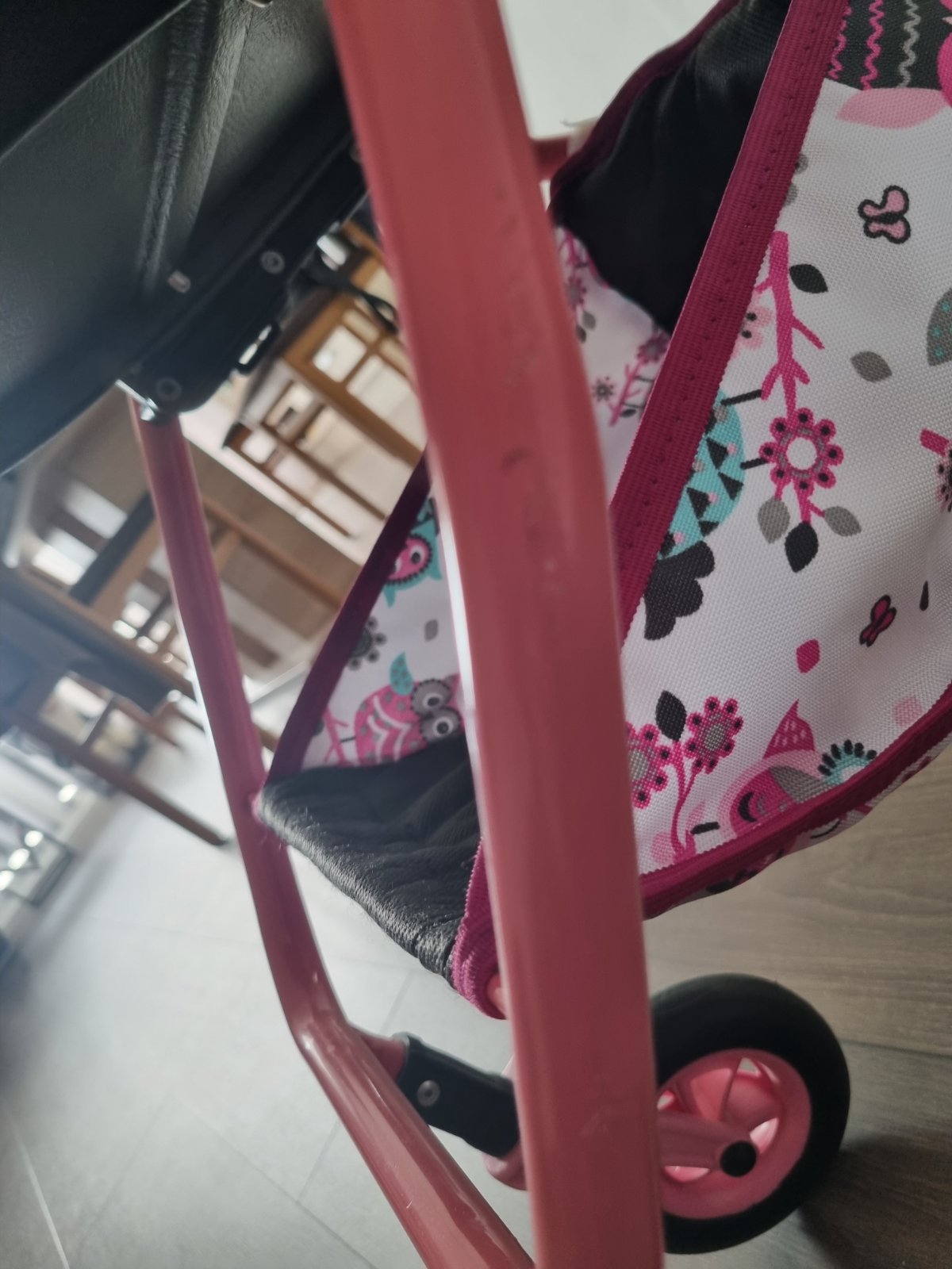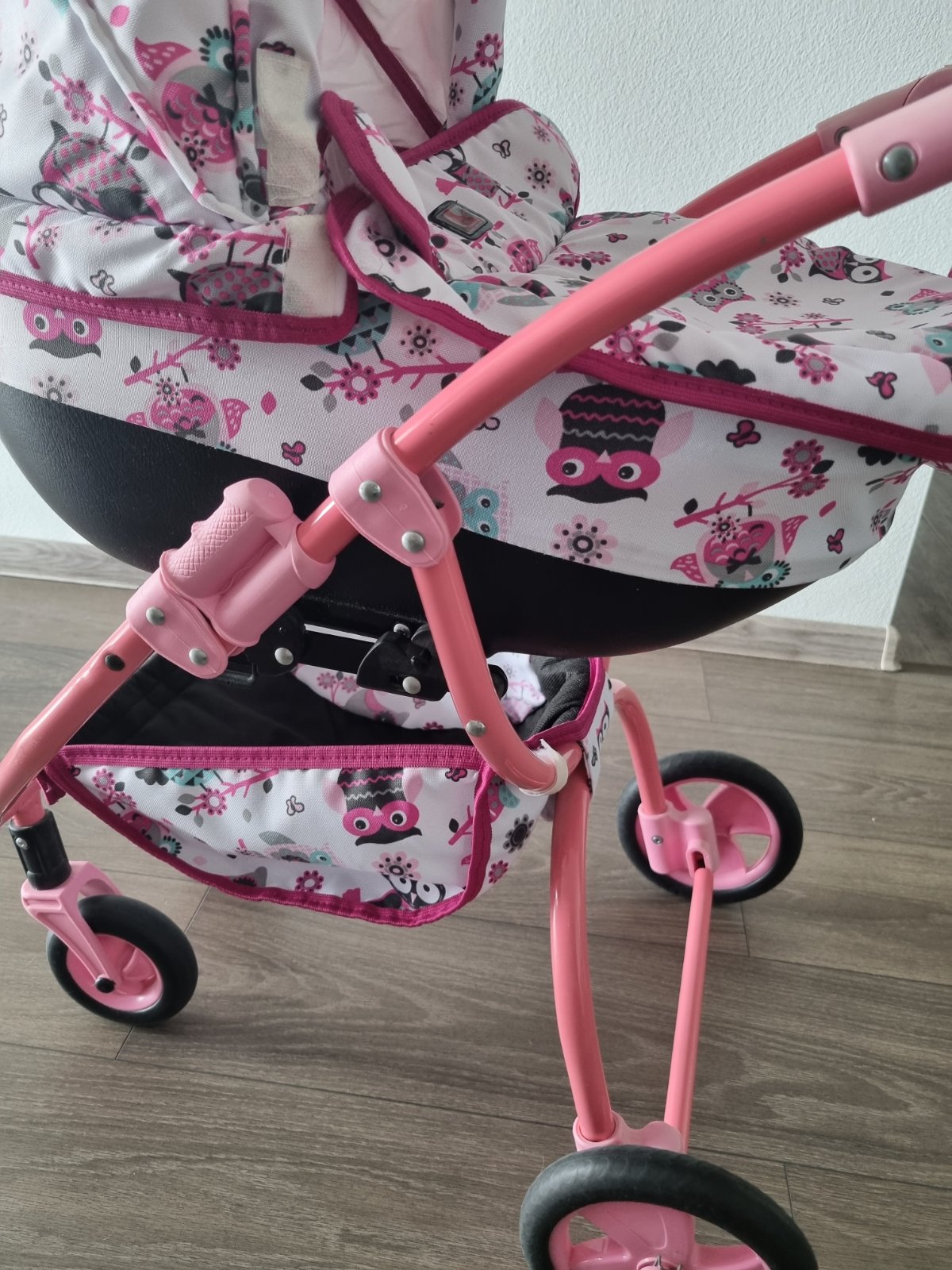 Krásny kočiarik,nastaviteľná výška rukoväte,od 3rokov až......,predné kolieska otočné-ľahká manipulacia pre dieťa.Gumové kolieska,žiadny rachot po podlahe.Materiál kočarovina,ľahko sa čistí,pár škrabančekov a trošku vyblednuté plasty.Stále krásny.