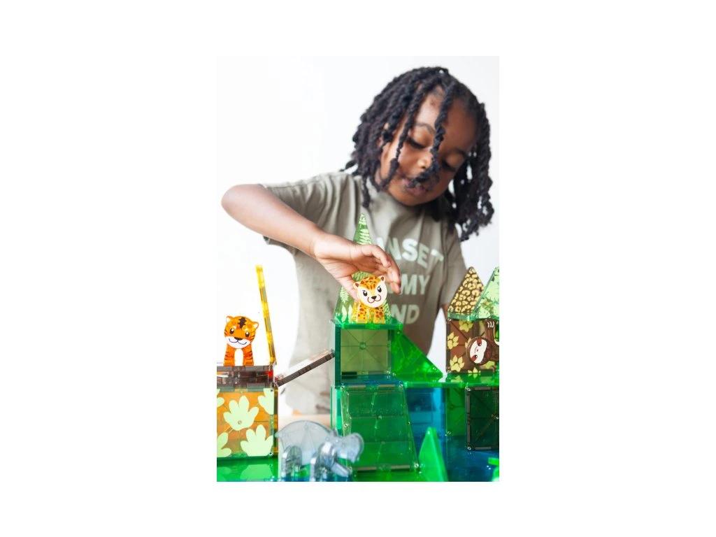 Úžasná magnetická stavebnica Magna-Tiles® Jungle prináša hodiny nápaditej a sústredenej zábavy. Obsahuje päť magnetických zvieratiek z džungle (hroch, leňochod, tiger, leopard a aligátor) s pohyblivými časťami, ktoré sú pripravené preskúmať divoký prales. Deti sa navyše naučia fakty o zvieratkách, ktoré v tomto záhadnom svete žijú. Všetky diely sú plne kompatibilné a dopĺňajú sa so všetkými ostatnými súpravami Magna-Tiles.