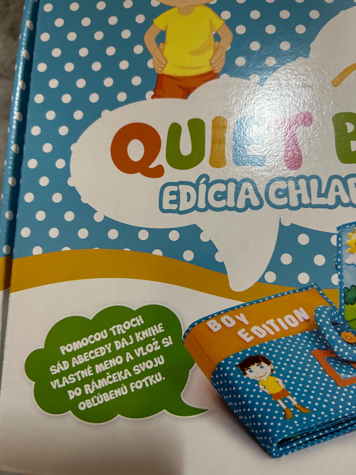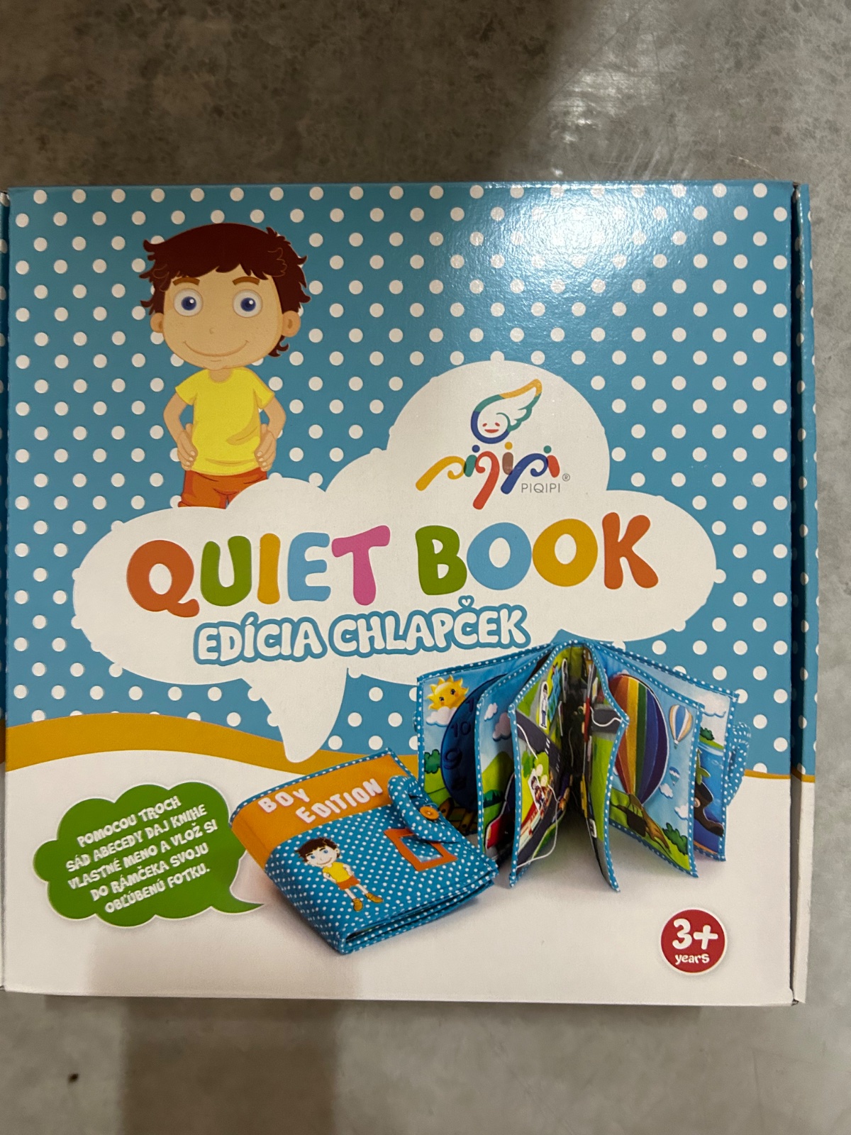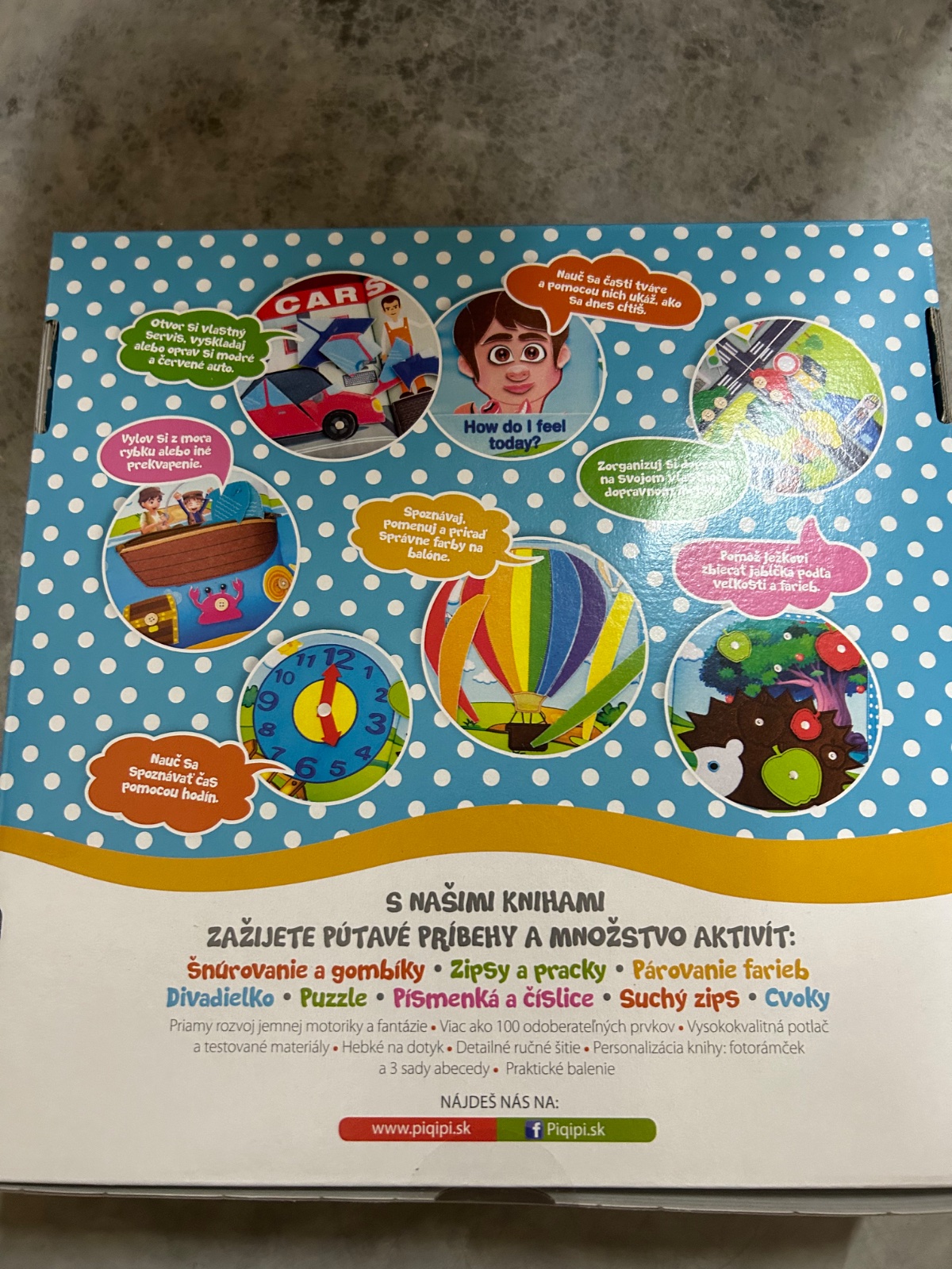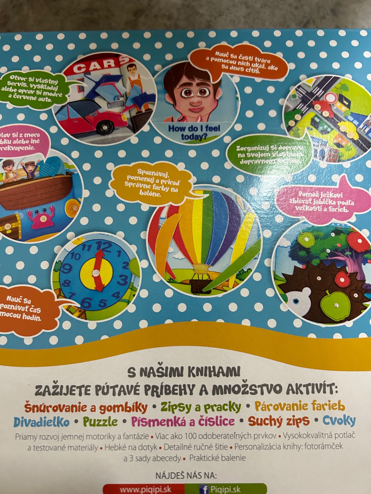 20p3k.Gombíky, zipsy, šnúrky... ktorý drobec by odolal? Interaktívne knižky Piqipi poskytnú detičkám možnosť zahrať sa s rôznymi druhmi materiálov a predmetov, a pritom sa vzdelávať. Môžu skladať puzzle, hrať sa s písmenkami, s číslami, s rôznymi geometrickými tvarmi, a to všetko v kvalitne prepracovanej knižke bez slov.Interaktívna knižka Chlapček je výsledkom precíznej ručnej práce. V knižke nájdete množstvo aktivít, ktoré zabavia každého chlapca či dievča. Tento originálny Quiet book umožní zahrať sa na opravára áut, chytať ryby či riadiť dopravu. Rozvoj jemnej motoriky, zábava a zároveň vzdelávanie, to je cieľom interaktívnych knižiek Piqipi.Piqipi je hračka, ktorú deti milujú. To dokazuje naše ocenenie Absolútny víťaz v súťaži Hračka roku 2017 a dizajn nominovaný v Red Dot Award.Obsahuje: 3 sady abecedy, rámček na fotku, hodiny s pohyblivým ciferníkom, 4 odoberateľné jablká na cvoky, 2 x 5 dielne puzzle na suchý zips, 2 odoberateľné kolesá na cvoky, 6 pohyblivých autíčok, 11 odoberateľých častí na suchý zips v dopravnom ihrisku, 16 odoberateľných častí tváre na suchý zips, 6 odoberateľných častí balóna na suchý zips, čln na zips, 9 predmetov zapínateľných na gombíky. Spolu 142 odoberateľných dielov.Knižka spolu obsahuje 6 listov.Rozmery balenia (D x Š x V): 27 x 8 x 27 cm
