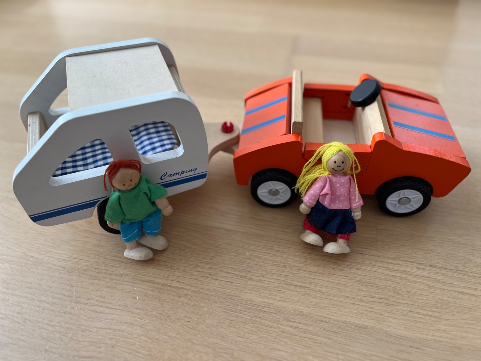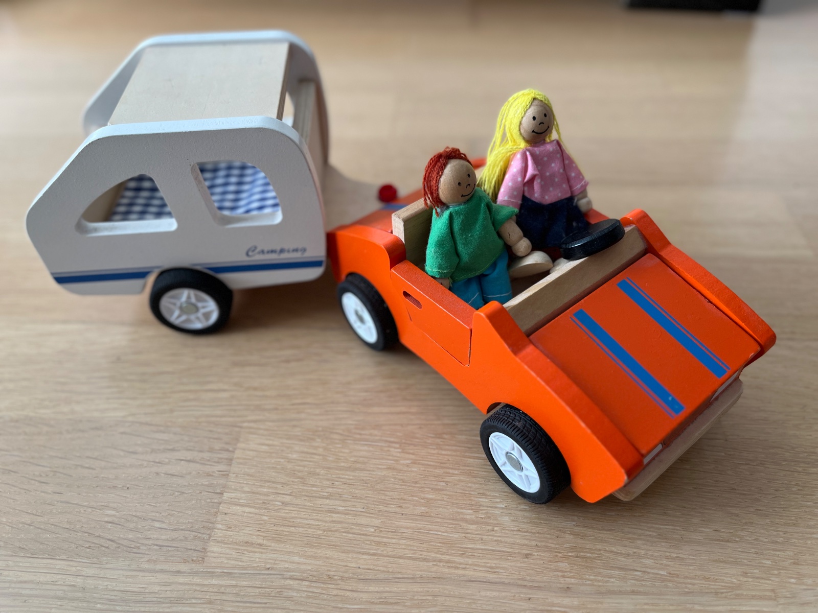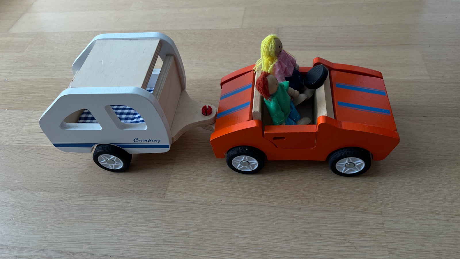 Drevený karaván s dvomi postavičkami. Na aute sa dajú otvárať všetky dvere vrátane predného a zadného kufra. Na karaváne sa otvára strecha. Autíčko môže jazdiť aj samostatne t.j. bez prívesu.