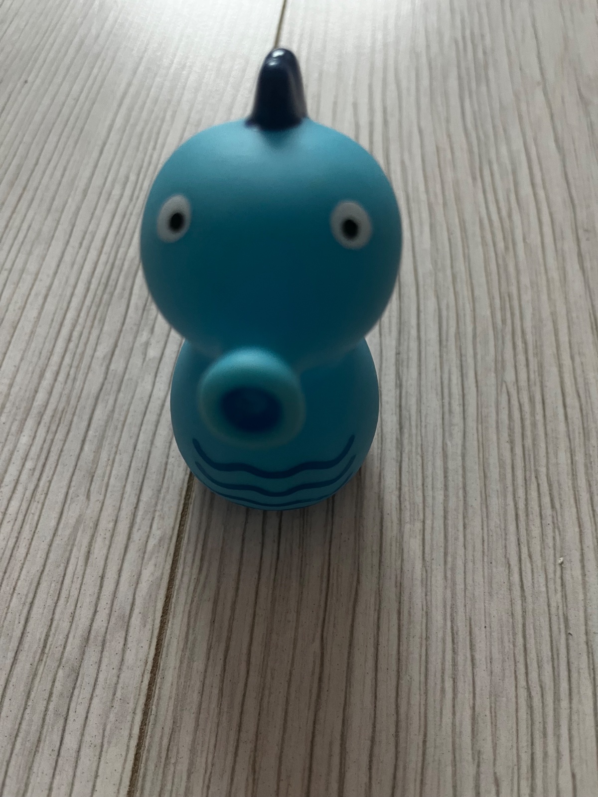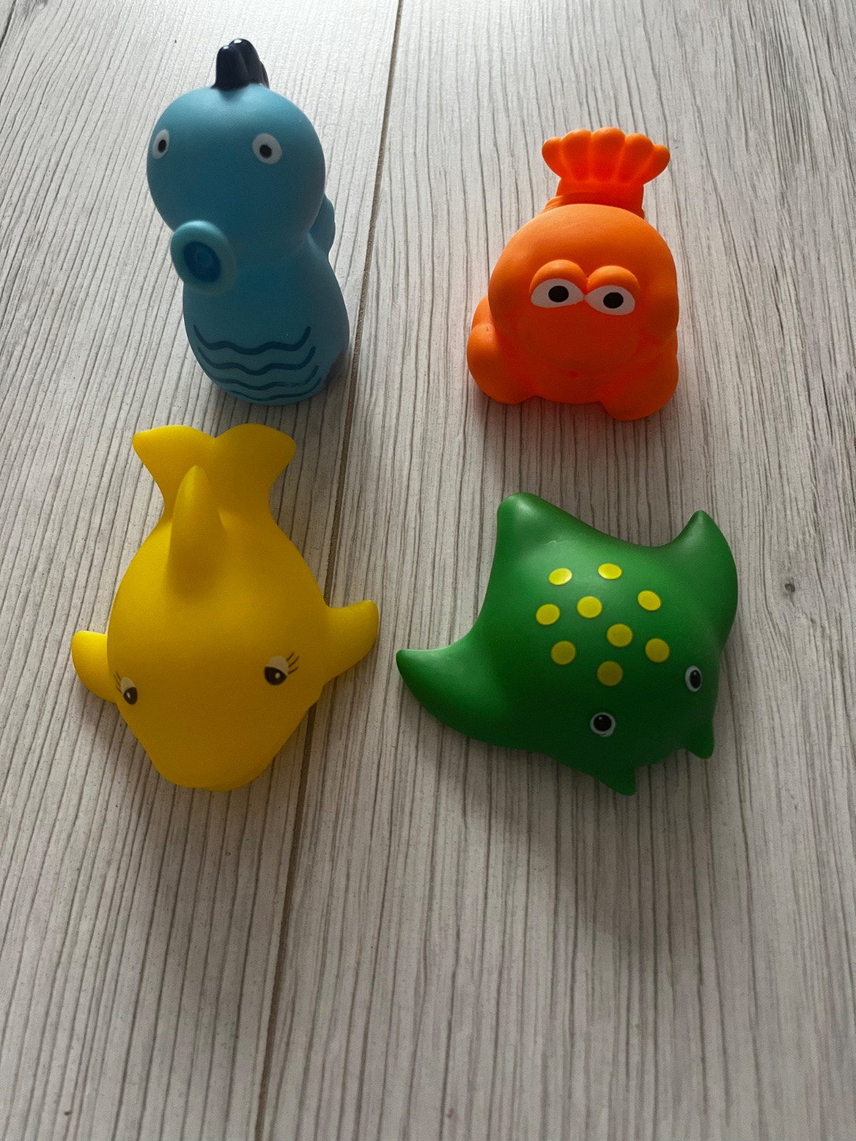 Súprava obsahuje 4 mäkké gumené figúrky s motívom morského sveta – žltého žraloka, oranžového kraba, modrého morského koníka a tmavozelenú raju so žltými bodkami.