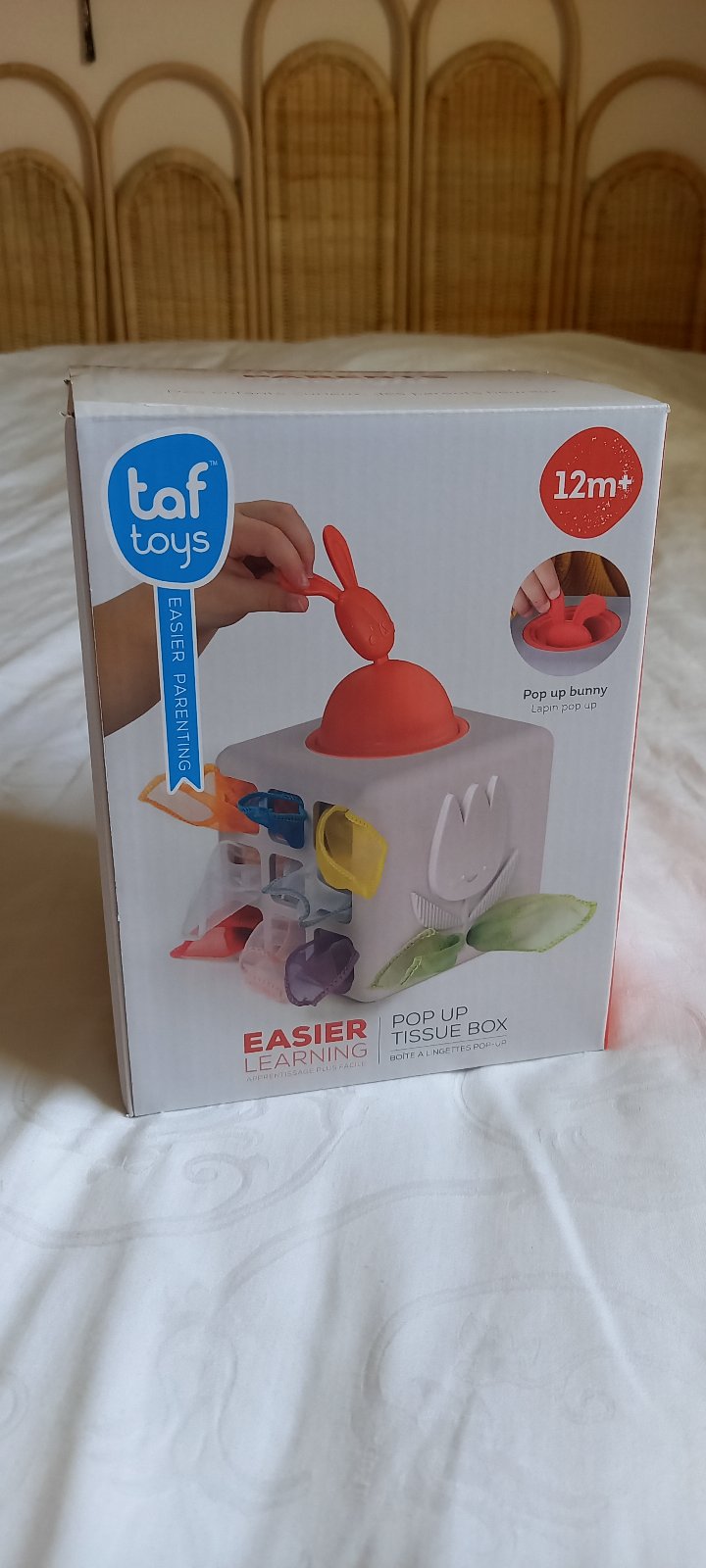 Originálna hračka v podobe boxu s vyťahovacími šatkami a vyskakovacím zajačikom dieťa zabaví a súčasne rozvíja jeho jemnú motoriku a jednotlivé zmysly. Box naplnený textilnými šatkami zaistí vášmu dieťaťu zábavu na dlhé hodiny a zároveň podporí rozvoj jeho zmyslov aj jemnej motoriky.Dieťa môže šatky z boxu vyťahovať a znovu ich do neho vkladať, skúmať ich textúry, v staršom veku potom spoznávať ich farby, počítať ich a pod. Box vyrobený z jemného silikónu ponúka rôzne typy otvorov na vyťahovanie šatiek, vyskakovacieho zajačika a 3-D motívy ježka a kvety. Box obsahuje 10 šatiek: 9 šatiek rôznych farieb z jemnej organzy a 1 šatka s potlačou zajačika. Rozmery: 13,5 x 13,5 x 13,5 cm, vek 12m+, vrátane krabice, 4 šatky majú vyparany lem/rožtek ( šikovná mamina zašije 👍) bez poštovného