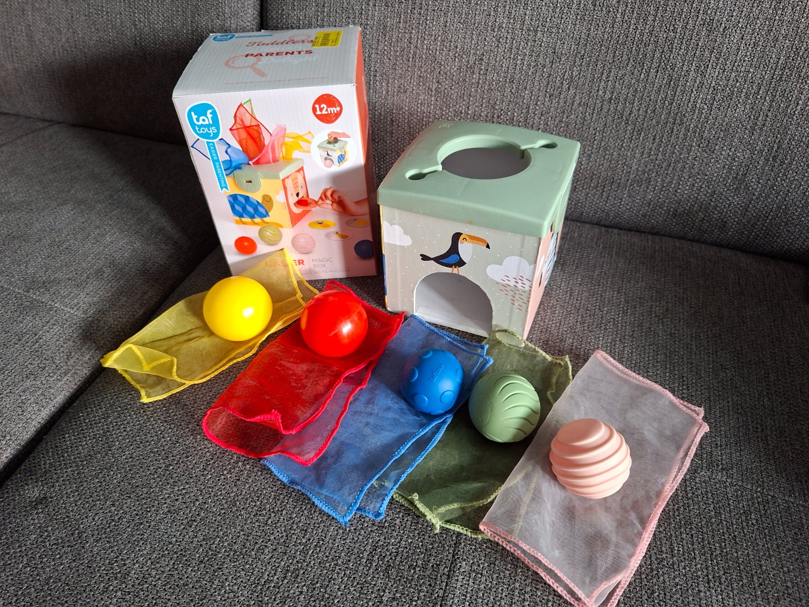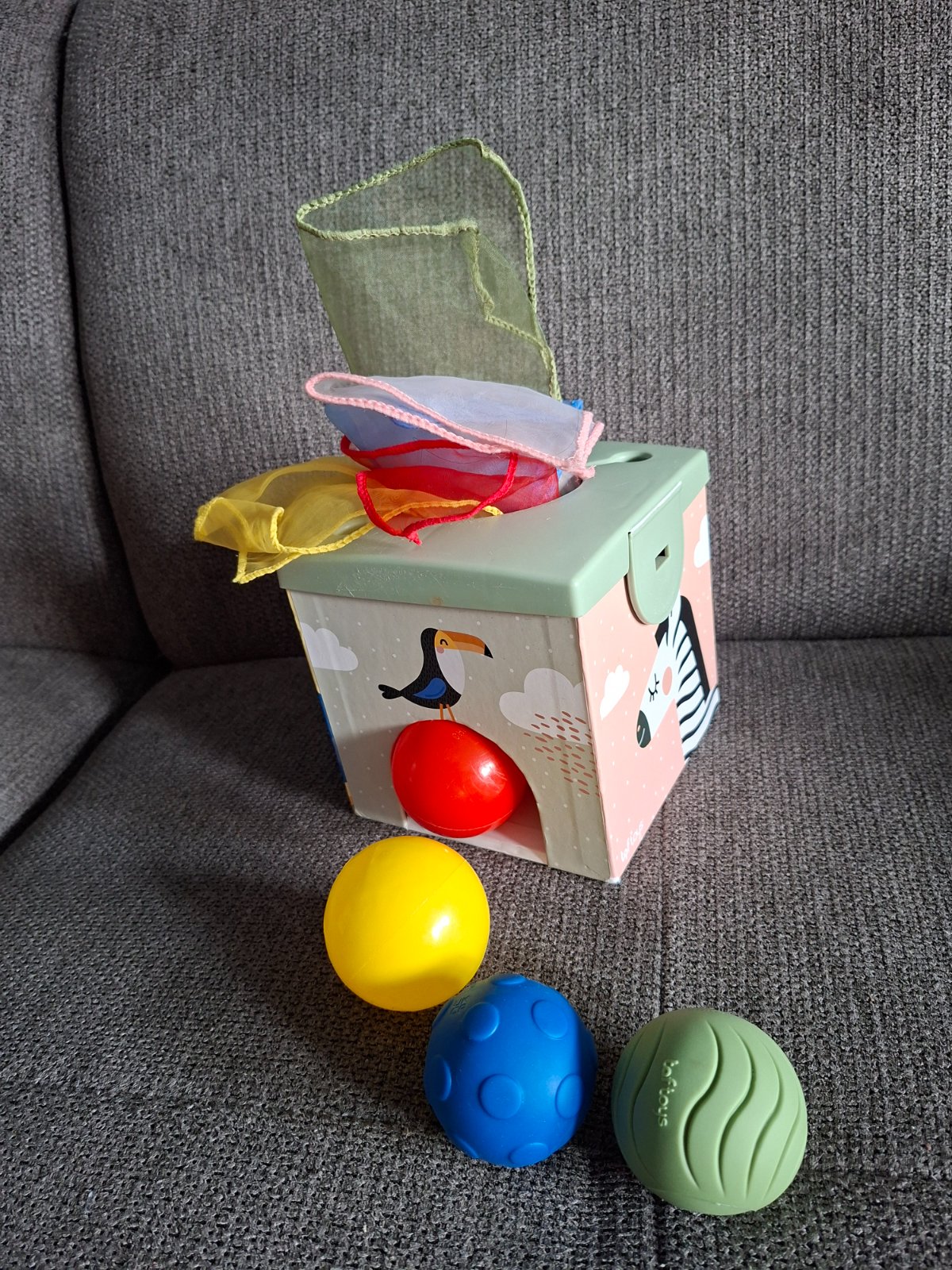 Vkladacia kocka, k nej 5 šatiek a 5 loptičiek, každá s iným povrchom. Obľúbená a veľmi vydarená hračka na precvičovanie motoriky a uvedomenia si, že "keď to nevidím, neznamená to, že to zmizlo". Píšu od 12m, ale hrali sme sa s ňou oveľa skôr.