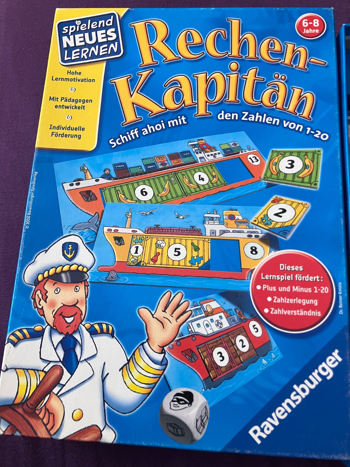 Kam ide banánová krabica? Je toto to miesto? V prístave námorníci nakladajú cenný náklad na svoje lode. Každá loď je výrazne veľká a musí byť naložená čo najlepším spôsobom. Ktoré lode sa naplnia ako prvé a môžu začať dobrodružstvo na otvorenom mori? Kapitán, ktorý počíta, ponúka množstvo cvičení na hravý tréning sčítania a odčítania v číselnom rozsahu od 1 do 20. Kapitán podporuje porozumenie číslam a rozvíja logické myslenie. Možnosť hrať sa osamote umožňuje deťom hrať sa a učiť sa samostatne.”