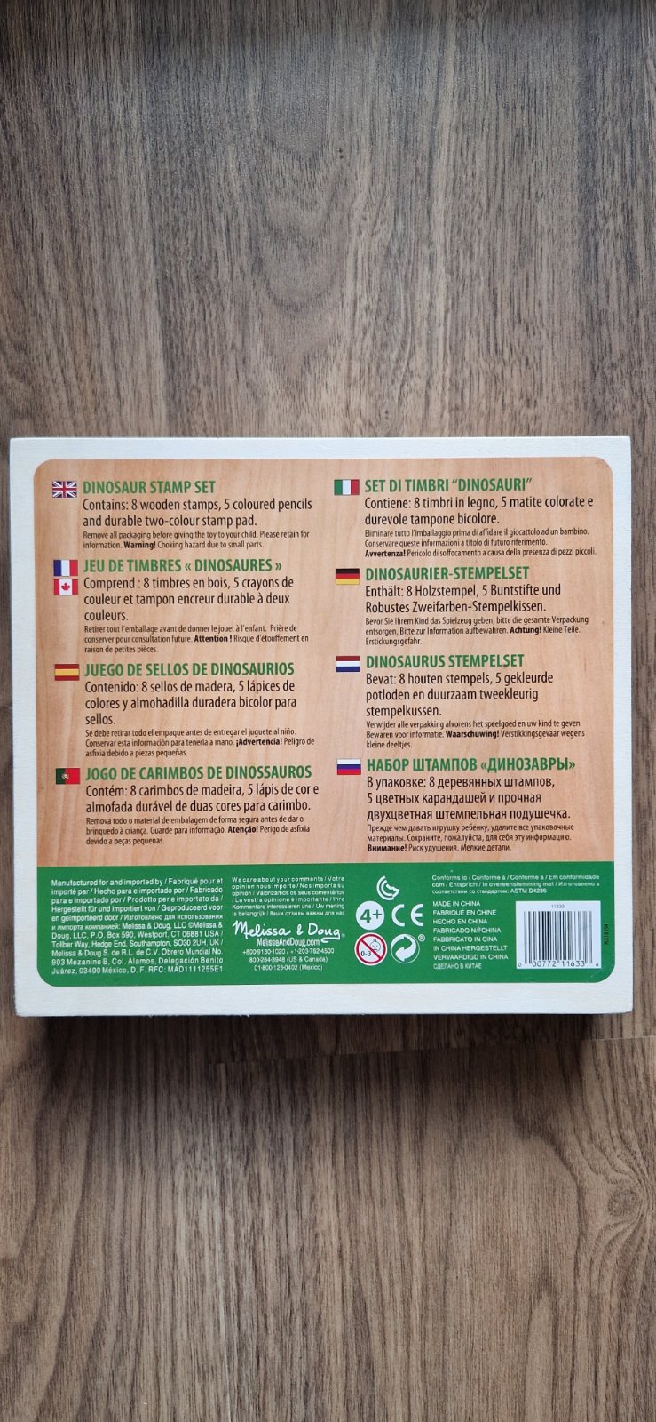 Ponúkam na predaj súpravu pečiatok Dinosaury, výrobca MELISSA & DOUG. Krásne drevené prevedenie. Dieťa si otlačenú pečiatku rôznych dinosaurov (7 ks: triceratops, ankylosaurus, pteranodon, tyranosaurus rex, stegosaurus, diplodocus, spinosaurus) alebo sopky (1 ks) môže vyfarbiť pastelkami. Rozmery pečiatok: 5x3,5 a 5x4,5 cm). Kreatívna a zábavná hra. Ako bonus pribalím aj novú sadu farbičiek (základné farby). Cena 8€.