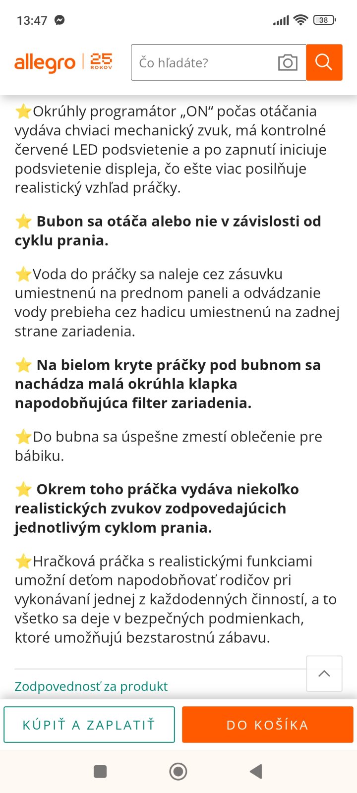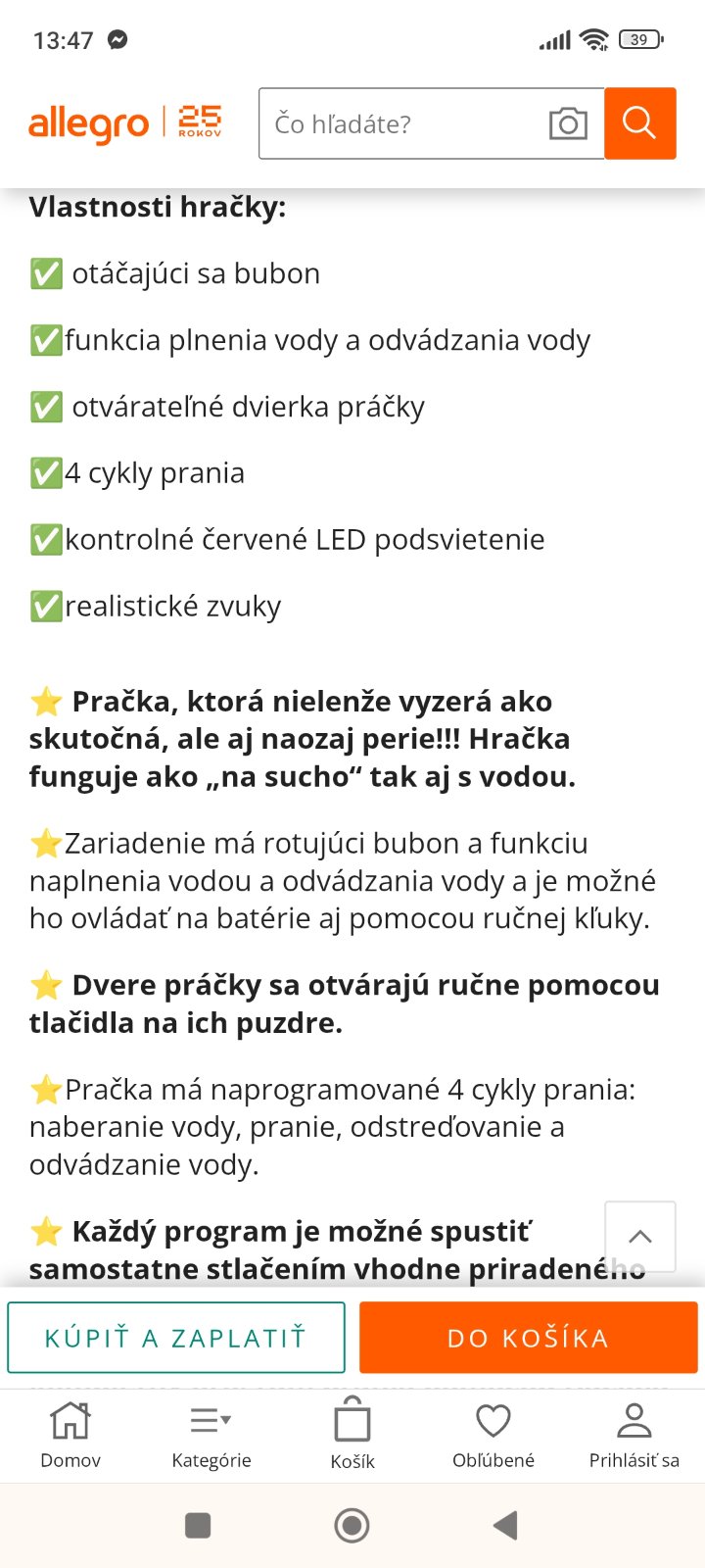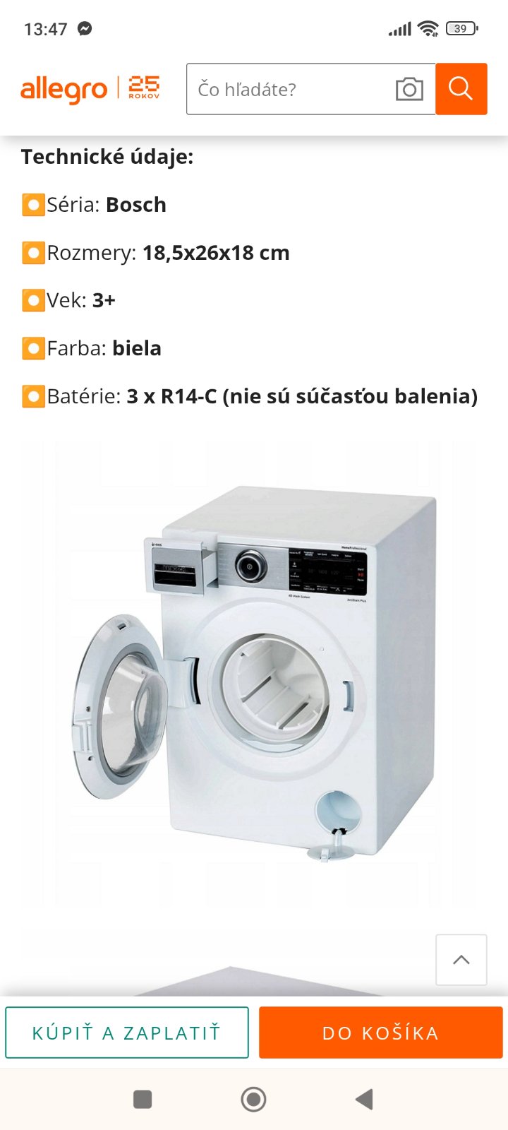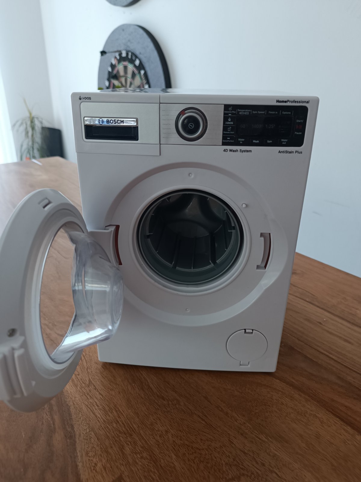 Posúvame plne funkčnú detskú práčku, vo výbornom stave. Jedine poškodenie je na jednom mieste trošku osuchnuta farba na dvierkach.