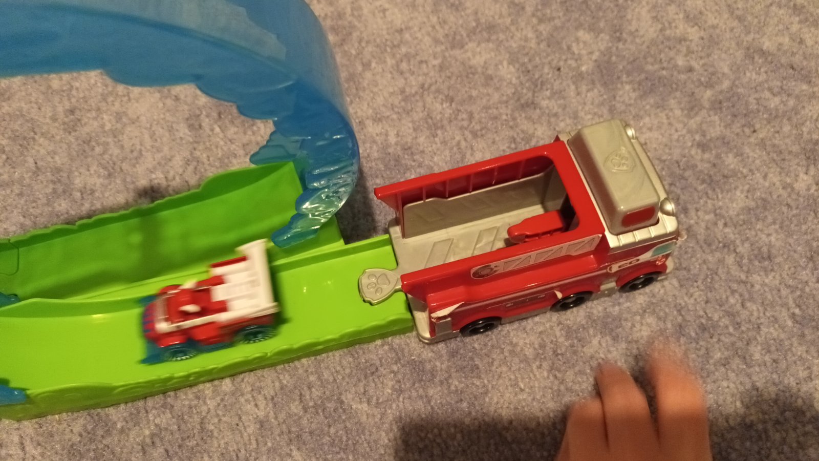Lapkova patrola draha s vystrelovacim autickom. Pa stlaceni alebo buchnuti na tlacidlo na streche auta vystreli auticko a dokaze obist okruh. Plne funkcne len nalepky trosku odlupnute