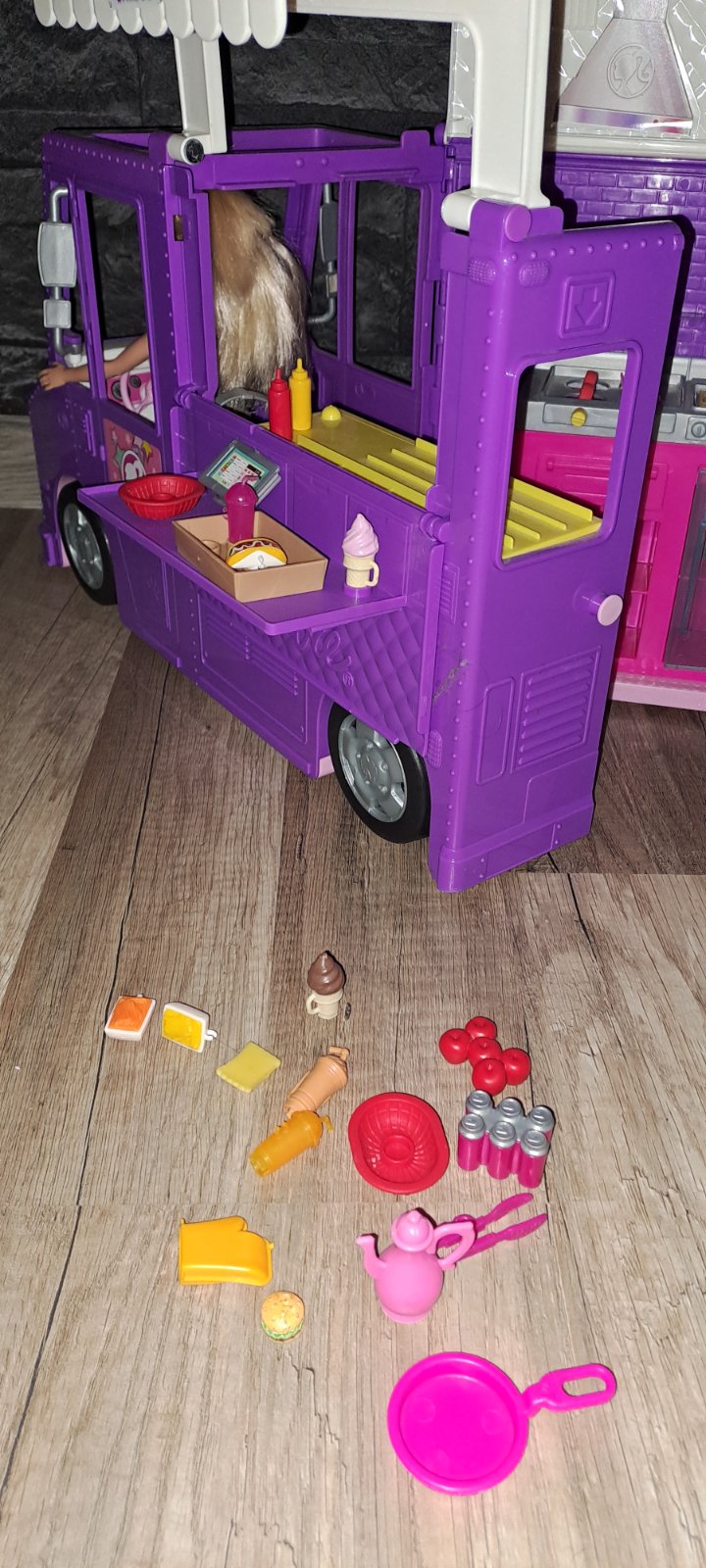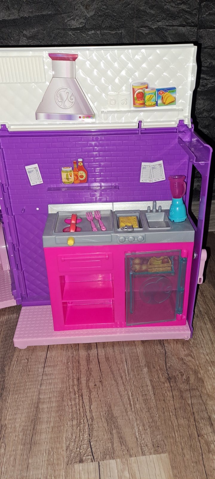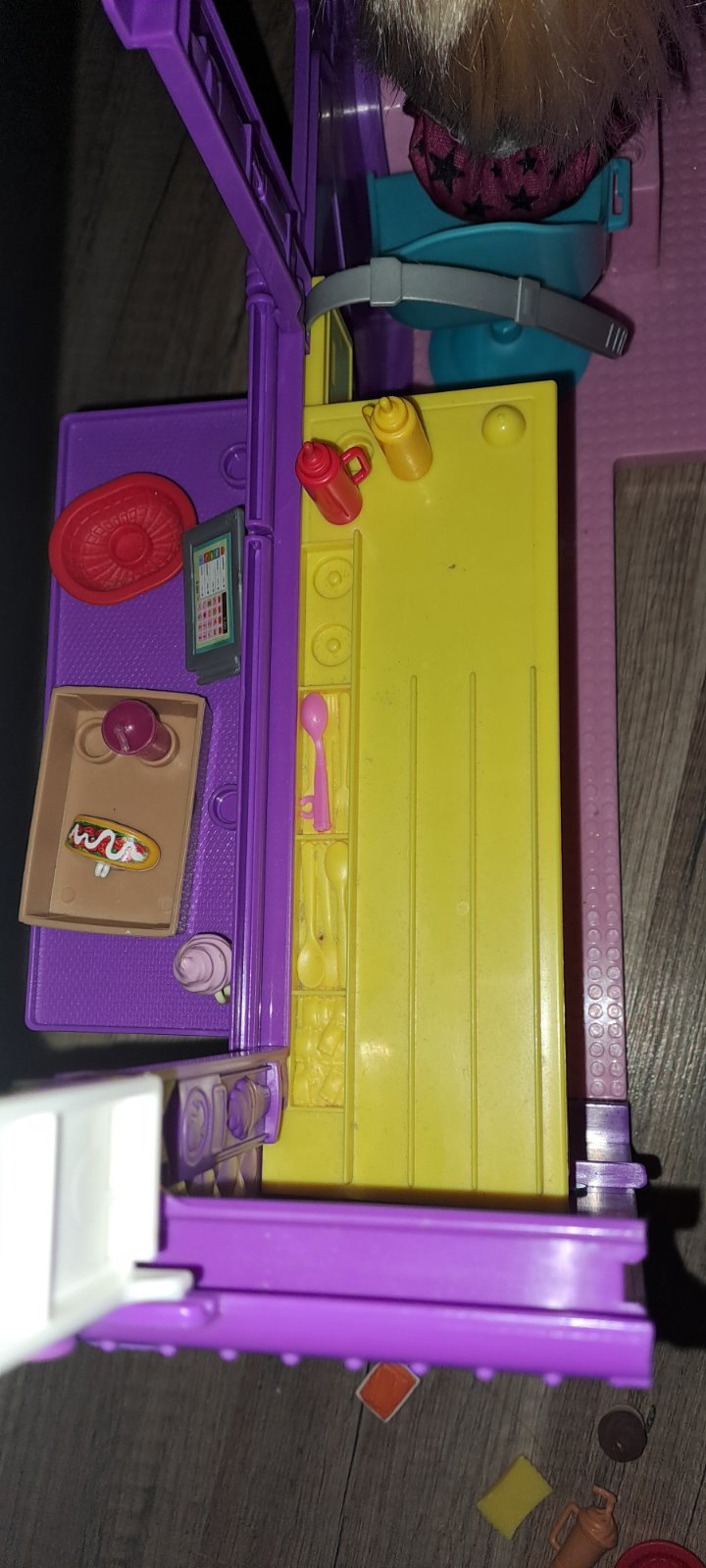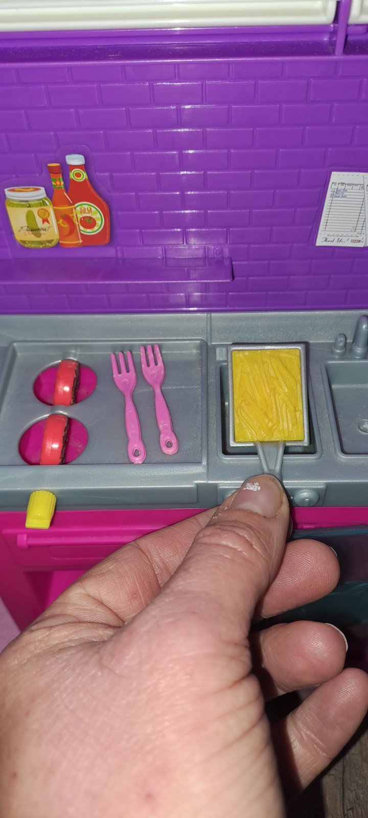 Málo hraný. Všetko, čo sme k nemu našli je na fotke. Chýba podľa všetkého jedna miska a obracačka, navyše sme pridali hamburger, čajník a koláčik a panvicu. Barbie som nenašla originál oblečenie, tak sme jej dali to na fotke🤗