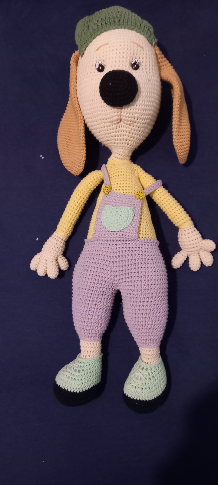 Krásny hackovany psík u nás nevyužité, iba vystavený, krásna ručná práca, meria cca.65 cm, pri krku by asi trebalo trosku viacej vyplniť