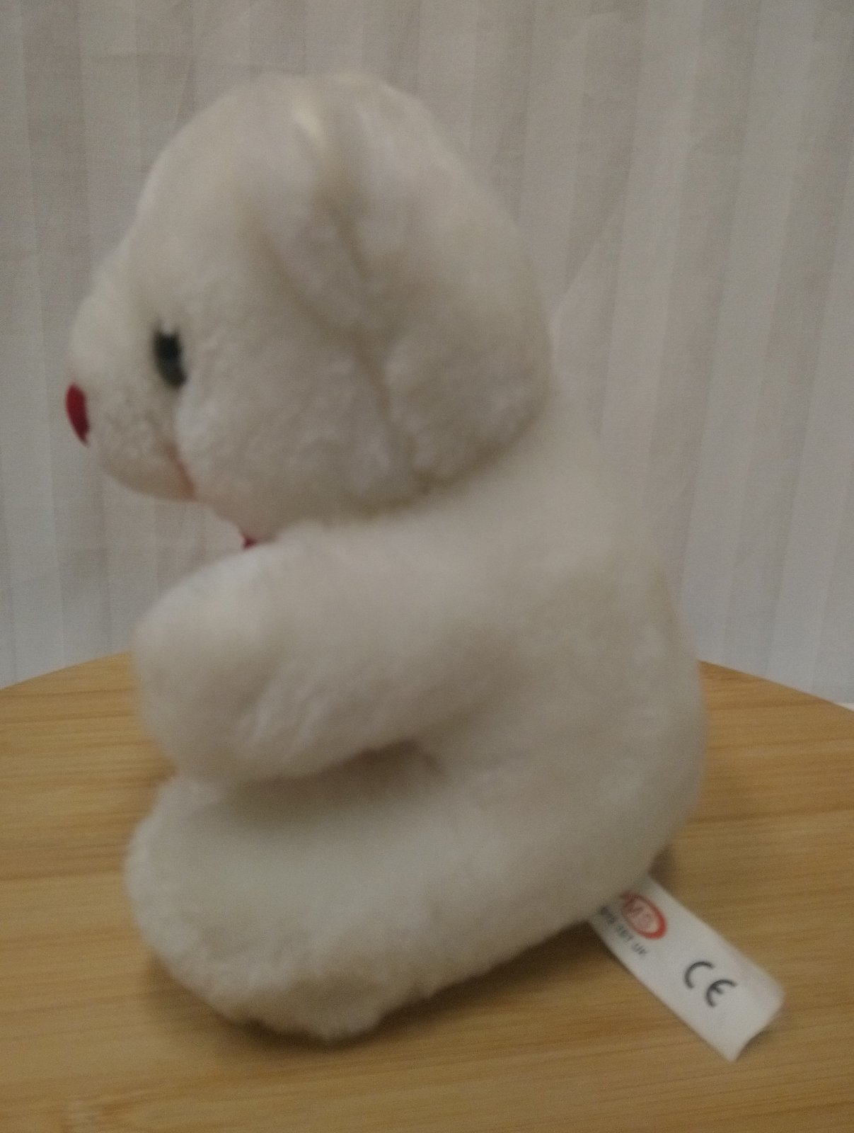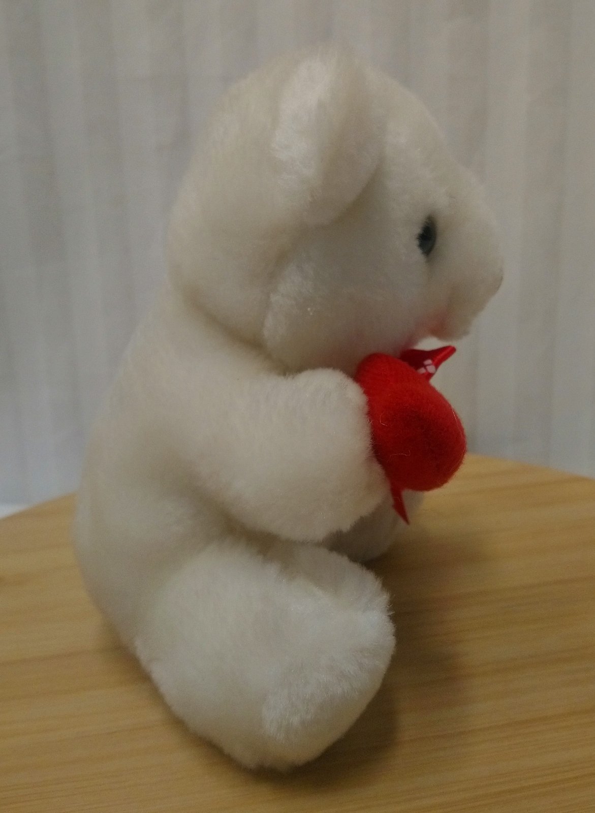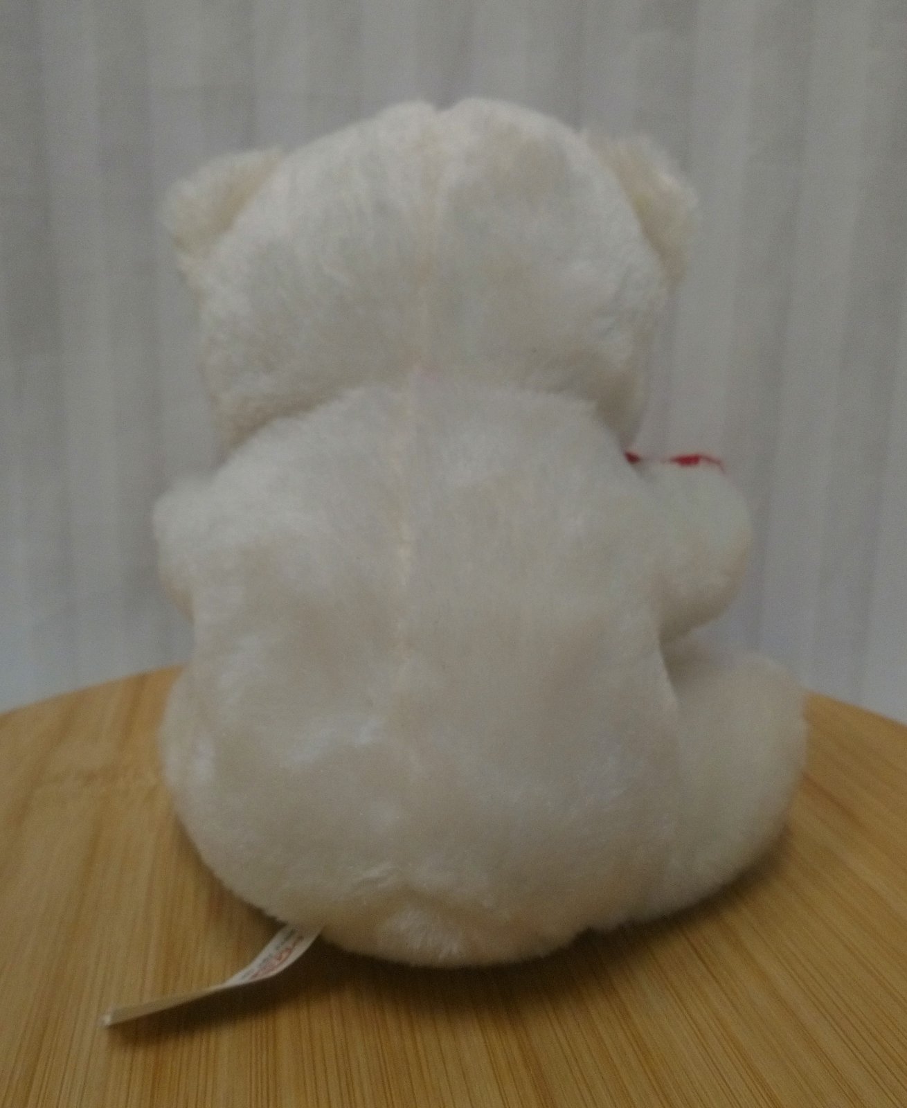 Plyšový biely medveď so srdiečkom, Pms, 15 cm, sediaci, má na labke červené srdiečko, a okolo krku červenú mašličku s bielymi srdiečkami,